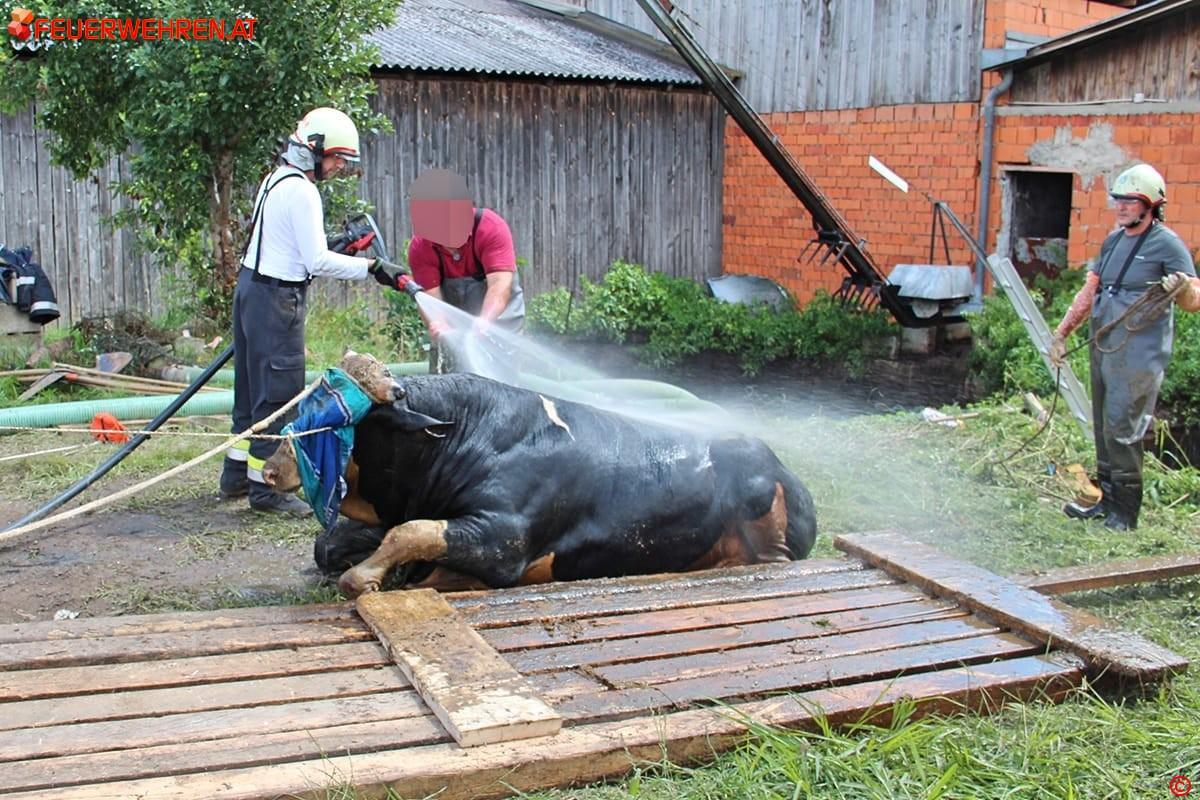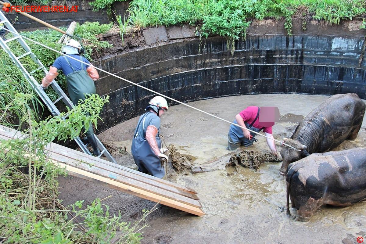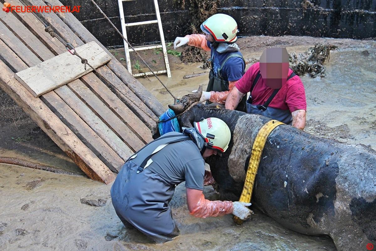 Nach dem Eintreffen der FF Pölfing – Brunn und der Erkundung durch den Einsatzleiter OBI Martin Puschnigg wurden die Feuerwehren Wies und Eibiswald sowie der Tierarzt nachalarmiert. Von den Kameraden der FF Pölfing – Brunn wurden als Erstmaßnahme die in der Güllegrube schwimmenden Stiere mit Seilen gesichert, damit die Luftzufuhr gewährleistet war.