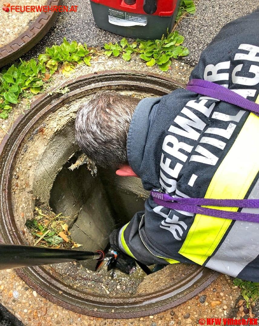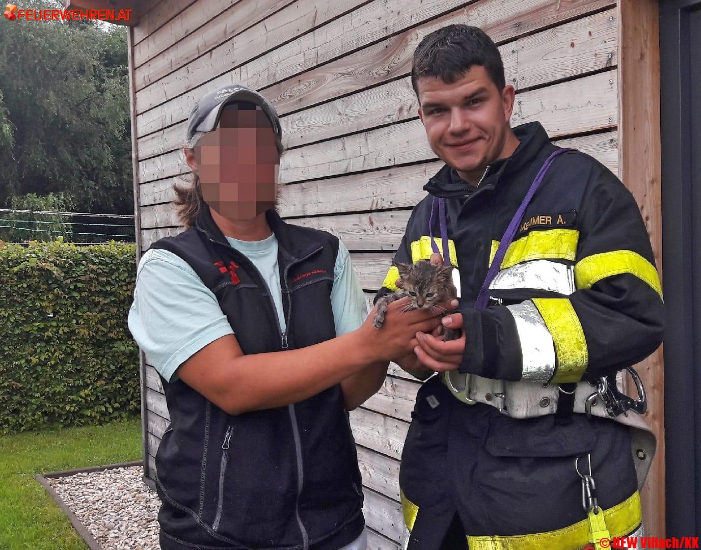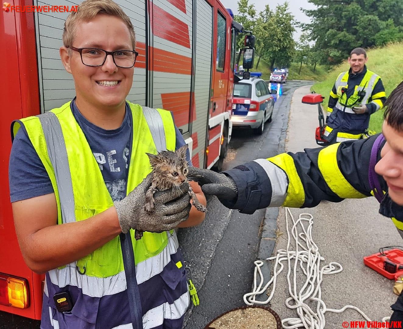 Ein Feuerwehrmann wurde mittels Seil kopfüber in den Schacht gelassen um mittels Taschenlampe das Kätzchen zu lokalisieren. Er konnte das Tier in der Mitte des Rohres ausmachen. Ein Kanalspülwagen der Villacher Saubermacher, welcher zufällig am Einsatzort vorbeikam, wurde gebeten mittels Spülschlauch auf einer Seite in das Rohr zu fahren um das Kätzchen dazuzubringen auf die anderes Seite des Rohres zu laufen wo der Mann es in Empfang nehmen würde. Das Tier nahm jedoch einen anderen Weg und verlief sich in das zur Straße parallel fliesende Abwasserrohr.