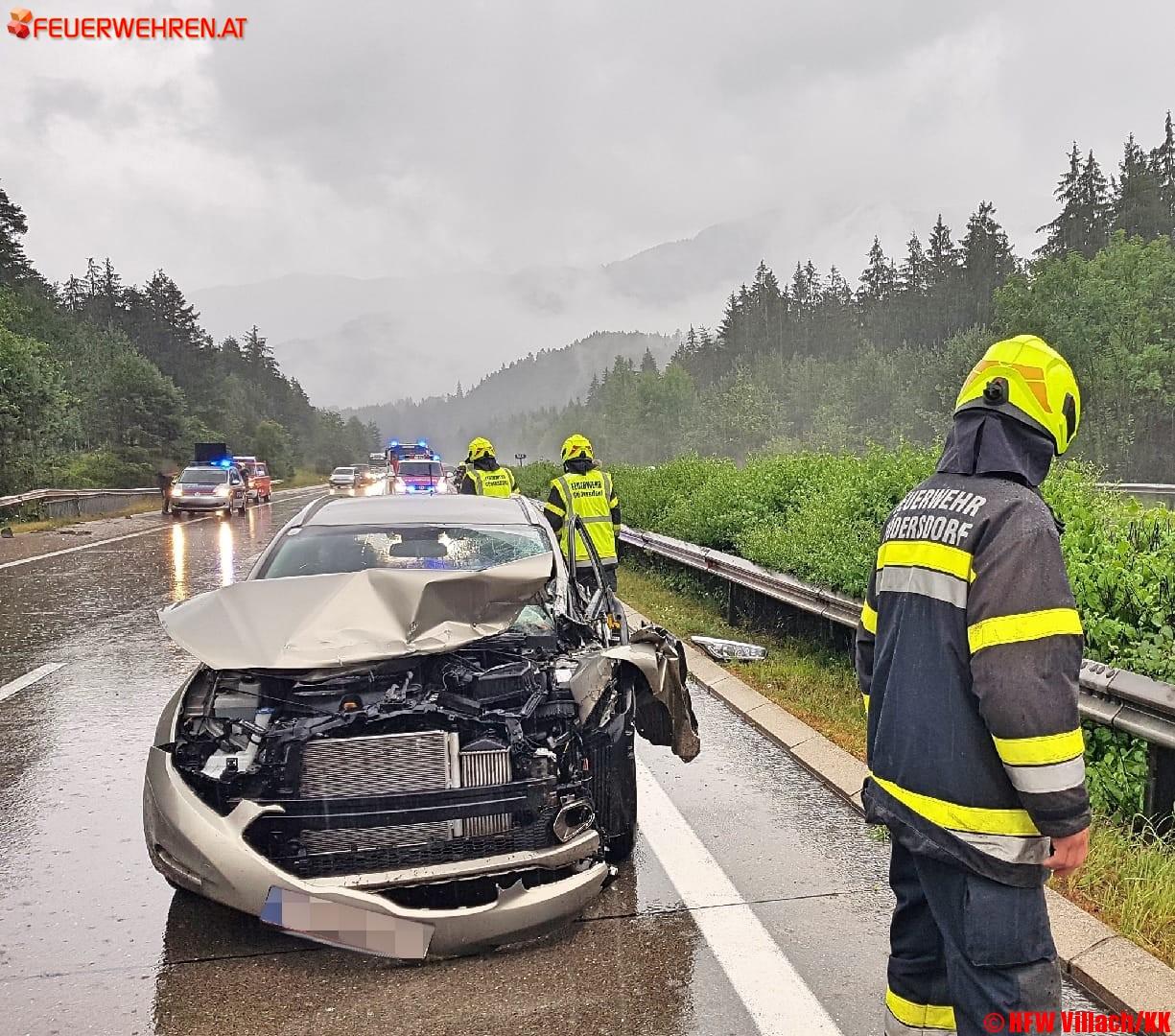 Nach einer kurzen Kontrolle durch den Notarzt des Rettungshubschraubers RK 1 wurde die Dame zur Kontrolle mit Verletzungen unbestimmten Grades ins LKH Villach mit einem Rettungswagen eingeliefert. Während des Einsatzes regnete es auf der Autobahn in Strömen.