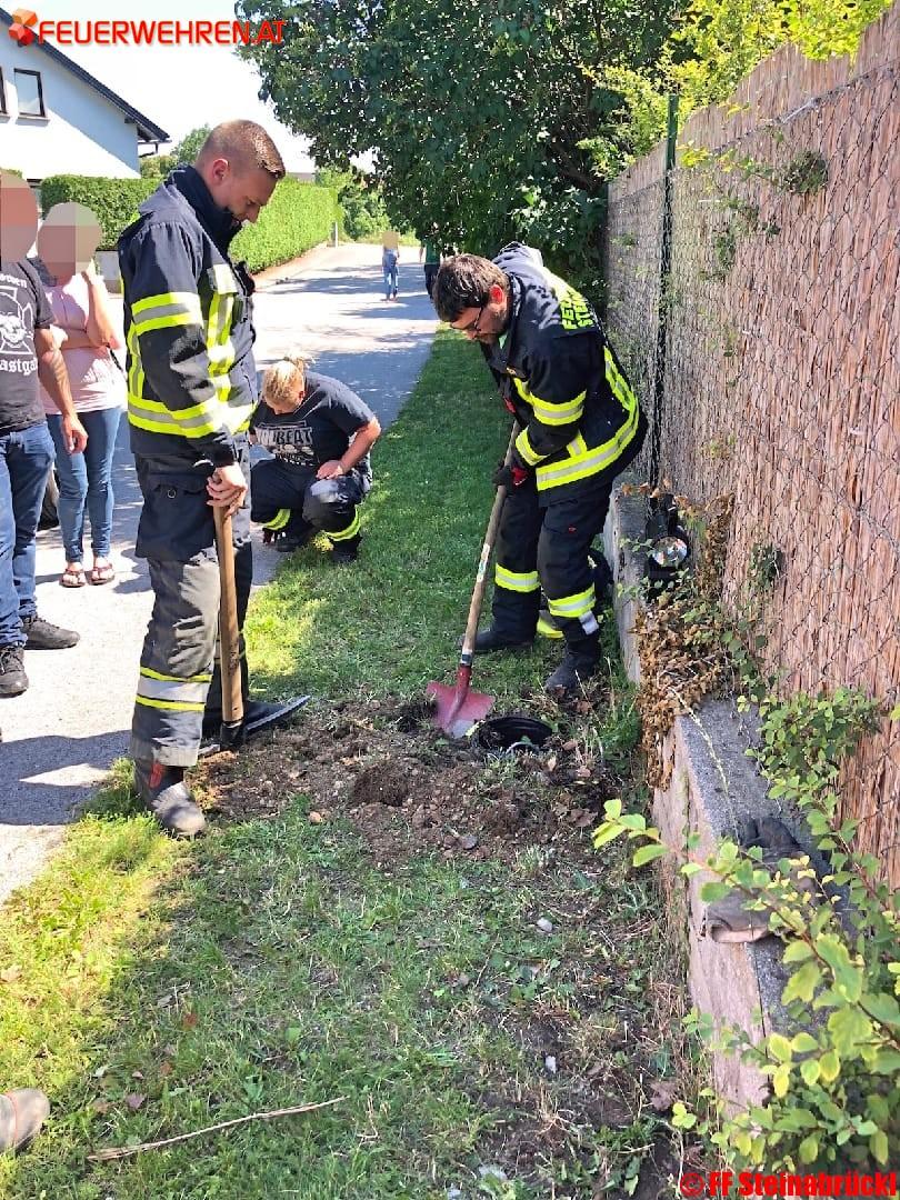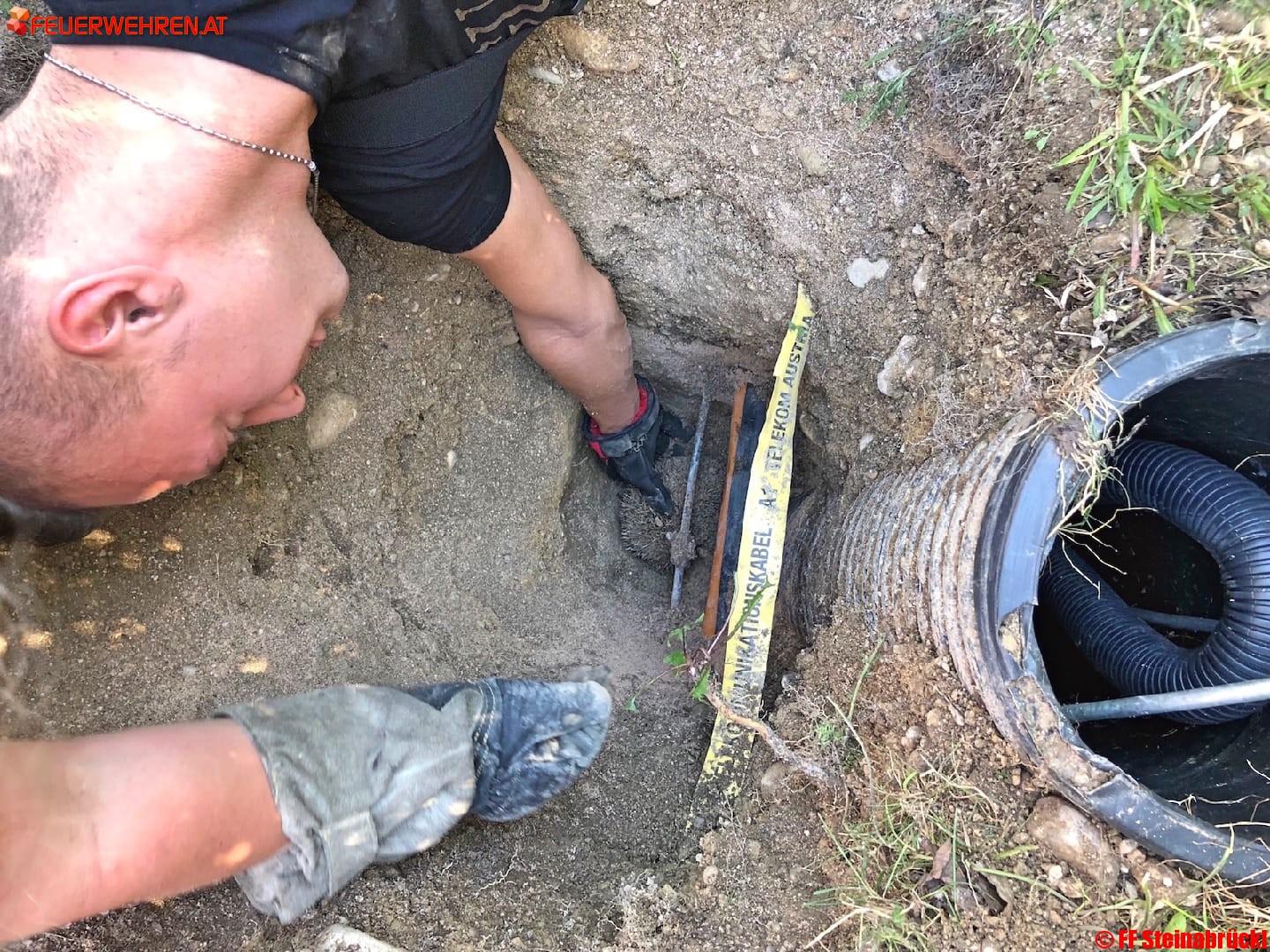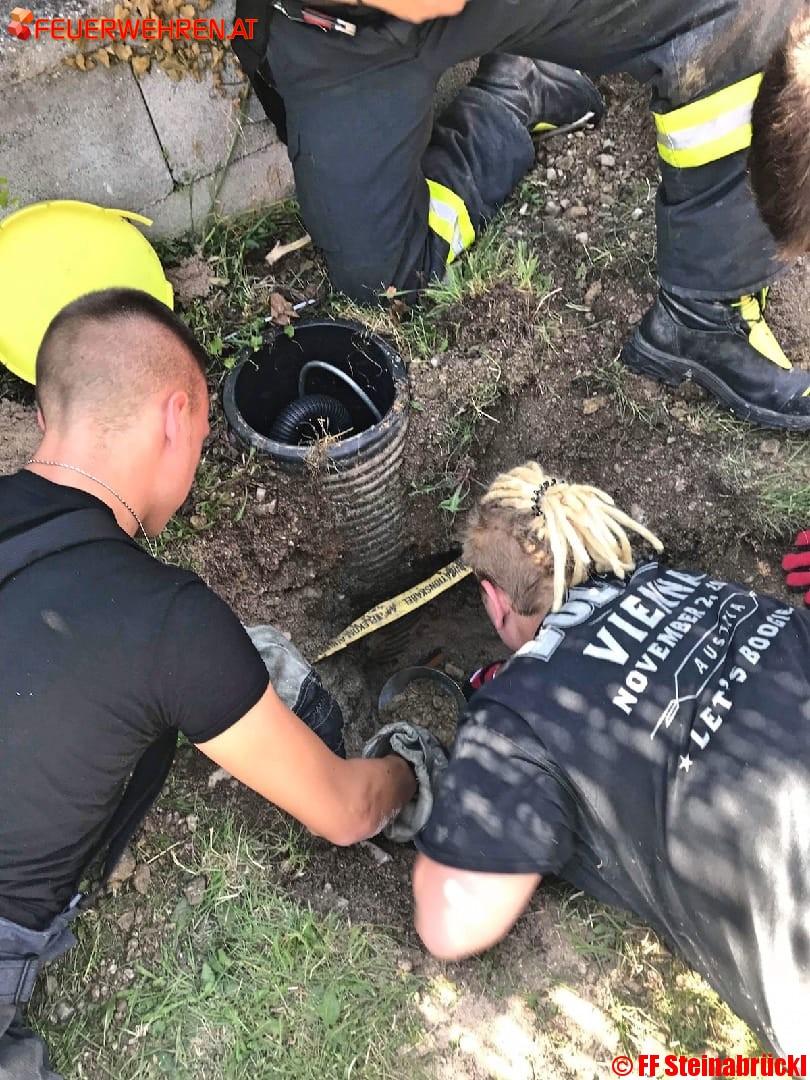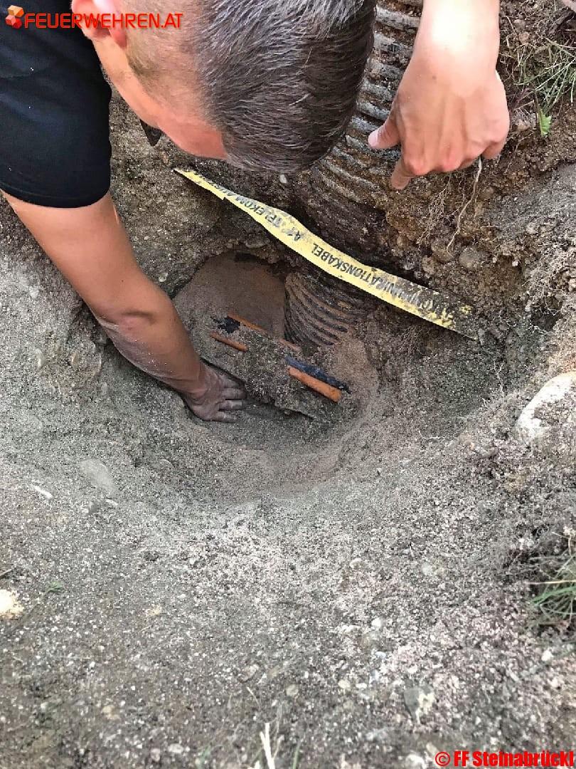 Am Samstag, den 30.Juni Nachmittags bemerkte eine Anrainerin beim Rasenmähen des Grünstreifens vor ihrem Haus, dass ein Kunststoffdeckel eines Kabelschachtes mit einem Durchmesser von rd. 30 cm für die neue Straßenbeleuchtung geöffnet war. Als sie den Deckel auf den Schacht legen wollte nahm sie Geräusche war und bemerkte so, dass ein Tier in den Schacht gefallen ist und unter das Schachtrohr gekrochen ist.