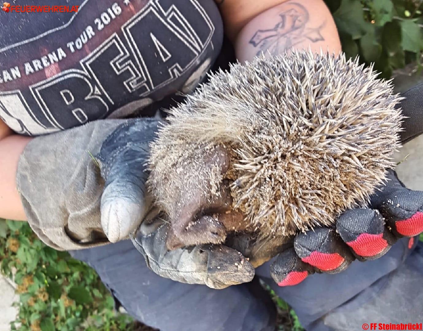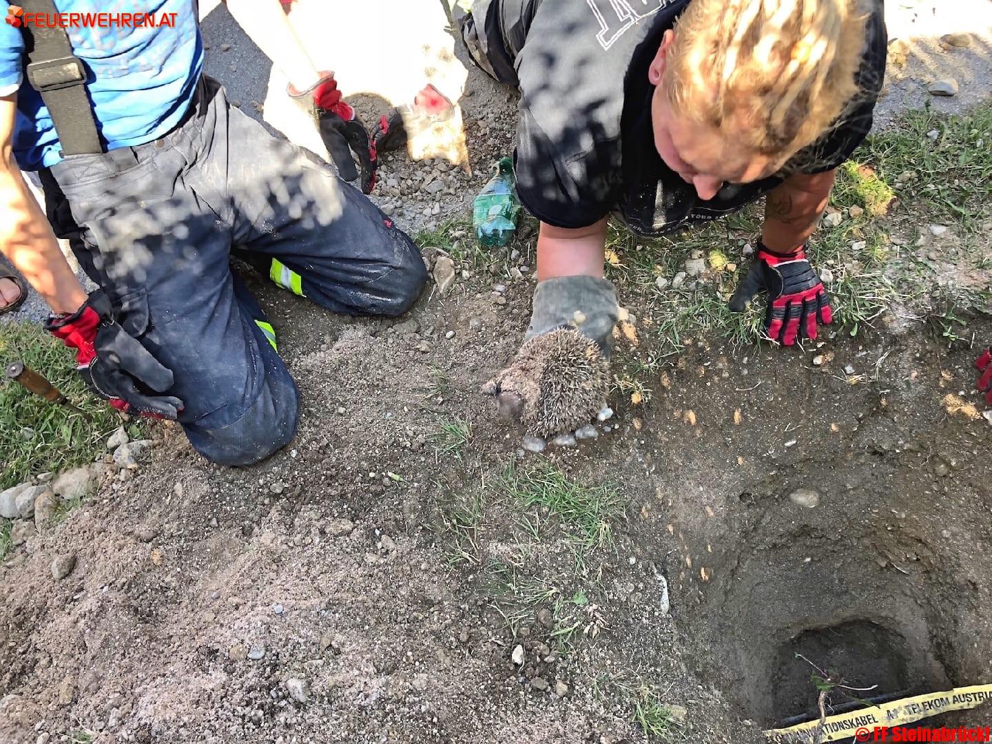 Nach dem Eintreffen der Feuerwehr wurde mehrmals versucht das Tier mit einer Hand zurück in den Schacht zu ziehen was aber nicht gelang. Festgestellt wurde, dass es sich um einen Igel handelt.