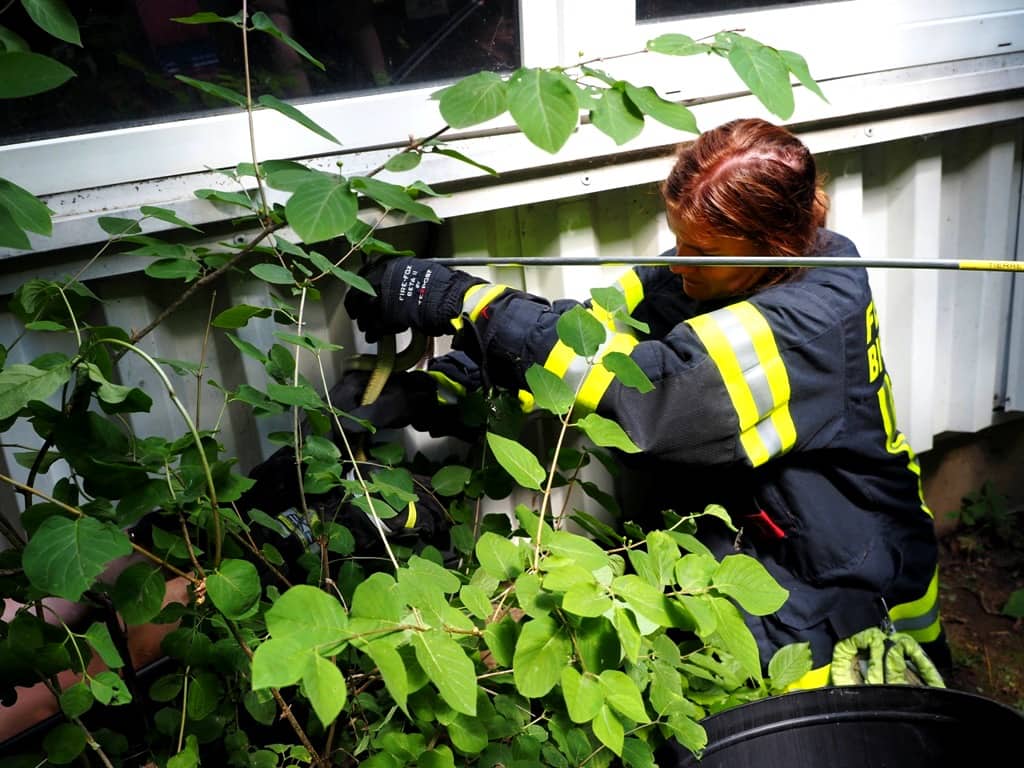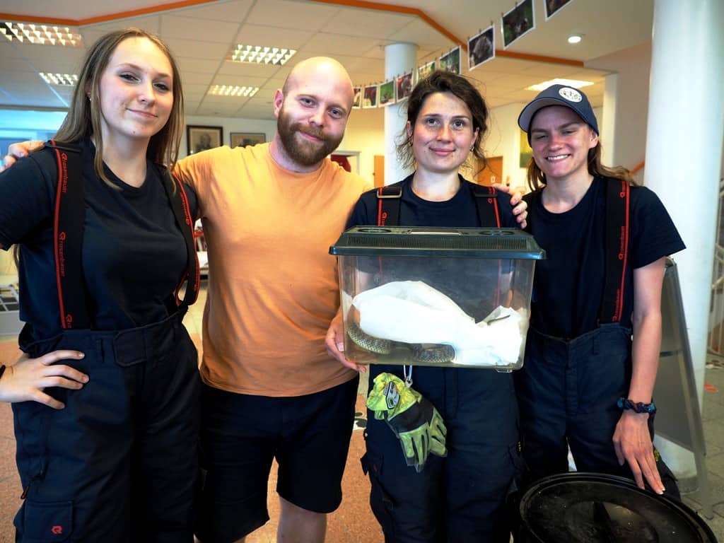 Zur Mittagsstunde des 01.06.2022 entdeckten aufmerksame Mitarbeiter eines Betriebes im Industriezentrum-Süd eine verletzte, blutende Schlange, welche sich hinter einer Fassadenverkleidung verkrochen hatte. Erst nach dem langwierigen Entfernen der Verkleidung konnte die Schlange gefunden und eingefangen werden.