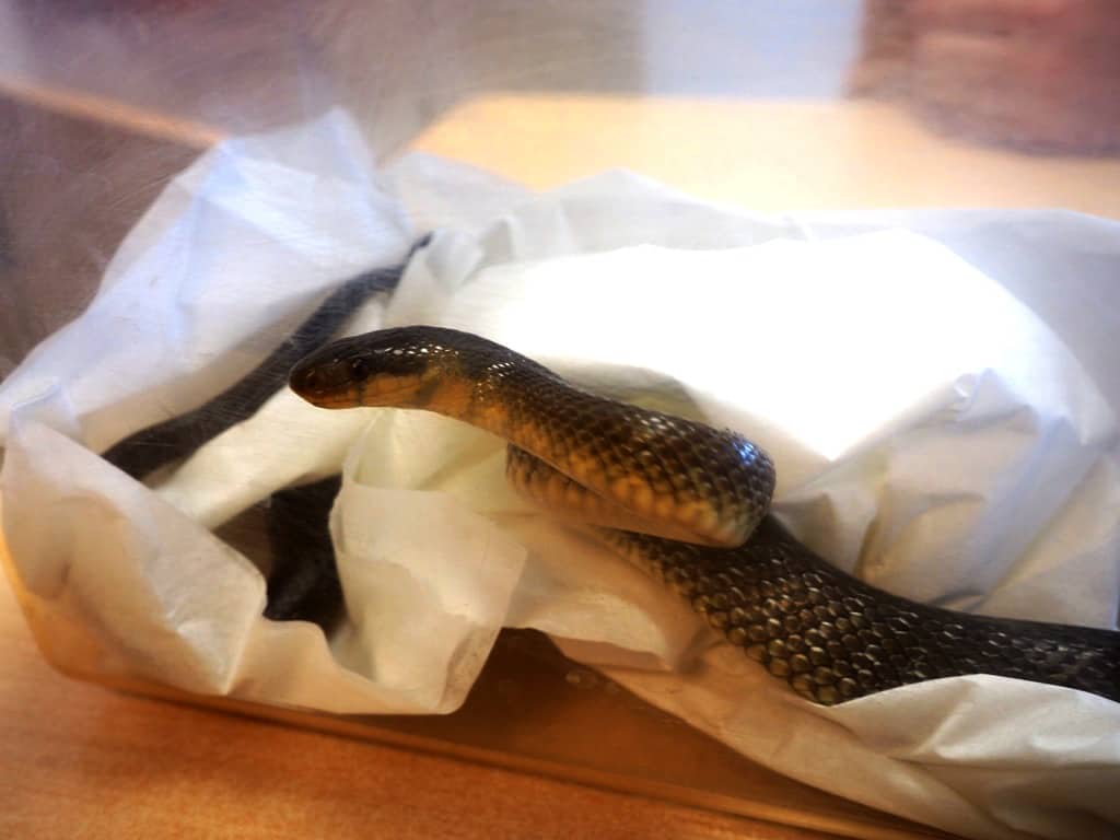 Wegen einer blutigen Verletzung wurde die ungiftige Äskulapnatter in das Tierschutzhaus Vösendorf gebracht und dort in Obhut fachkundiger Kräfte übergeben.