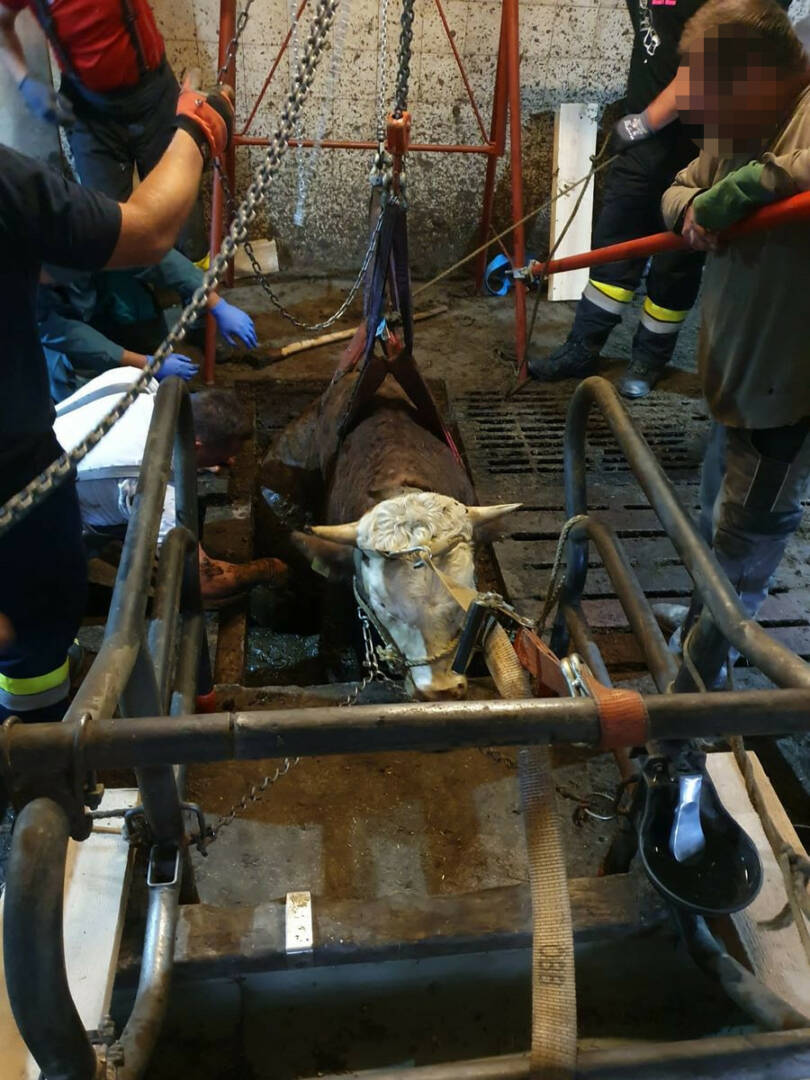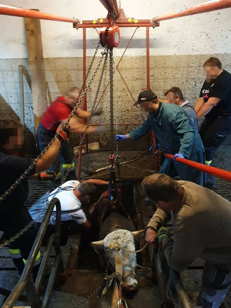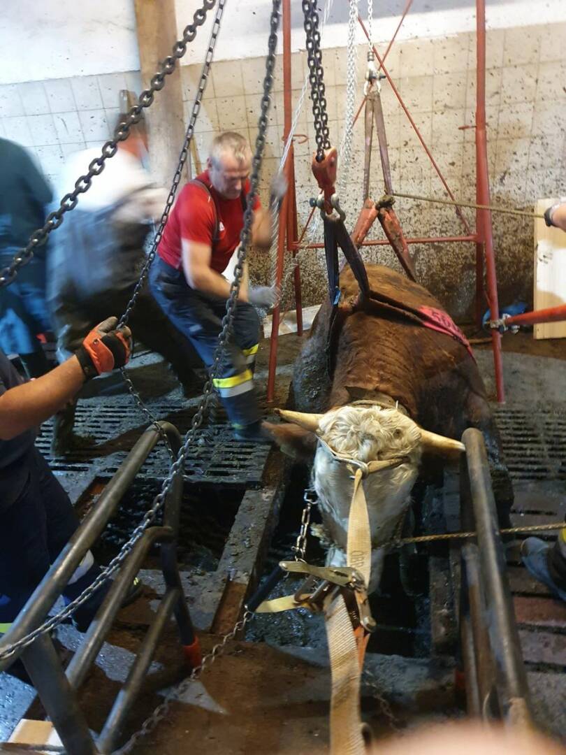 Eine Gruppe Männer der FF Eisbach-Rein (Gemeinde Gratwein-Straßengel, Graz-Umgebung) und ein Spezialhebezeug waren am Montagvormittag erforderlich, um einen Stier aus einer misslichen Lage zu befreien. Weil ein Bodenelement im Stall verschoben war, stürzte das Tier in den darunterliegenden Kanal.