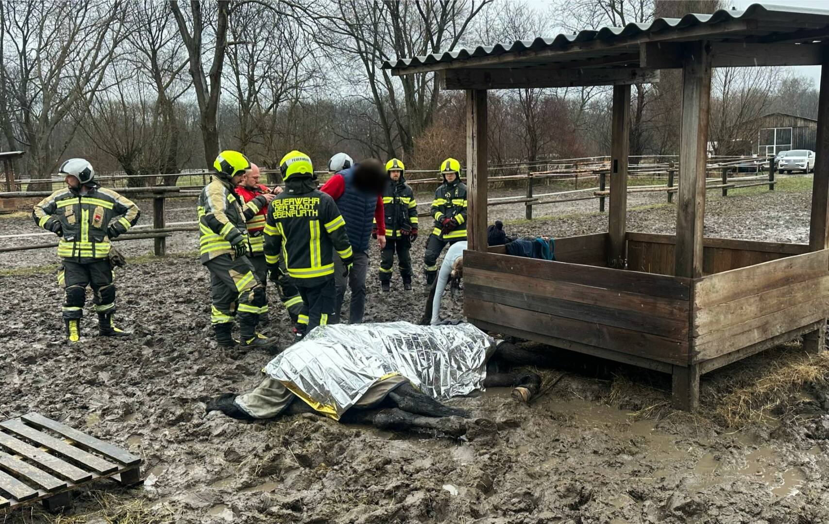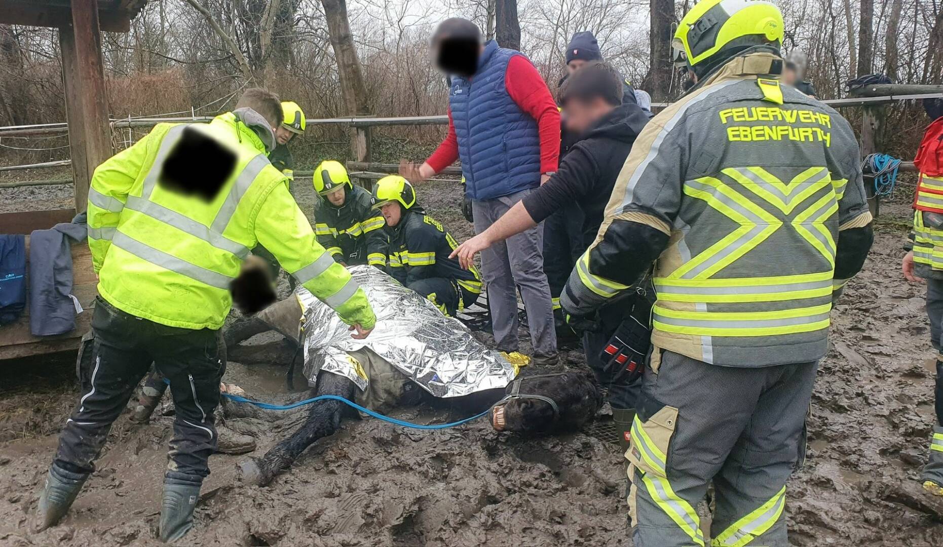 In enger Zusammenarbeit zwischen Tierarzt, Feuerwehr und Besitzern gelang es das Pferd von der Heuraufe wegzuziehen und beim Aufstehen zu unterstützen. Da aufgrund des matschigen Bodens mit keinem Fahrzeug zugefahren werden konnte mussten diese Tätigkeiten per Muskelkraft erledigt werden.