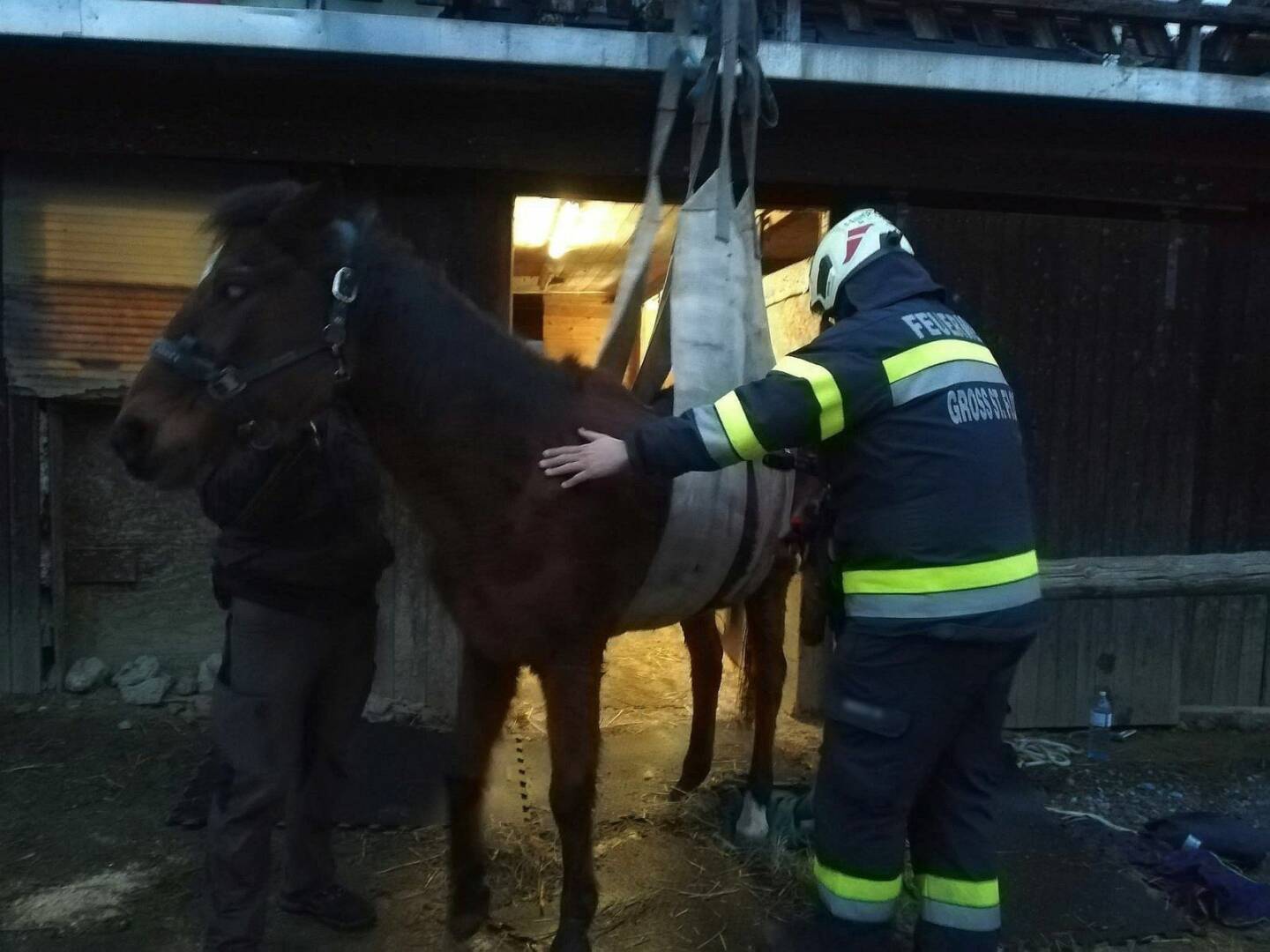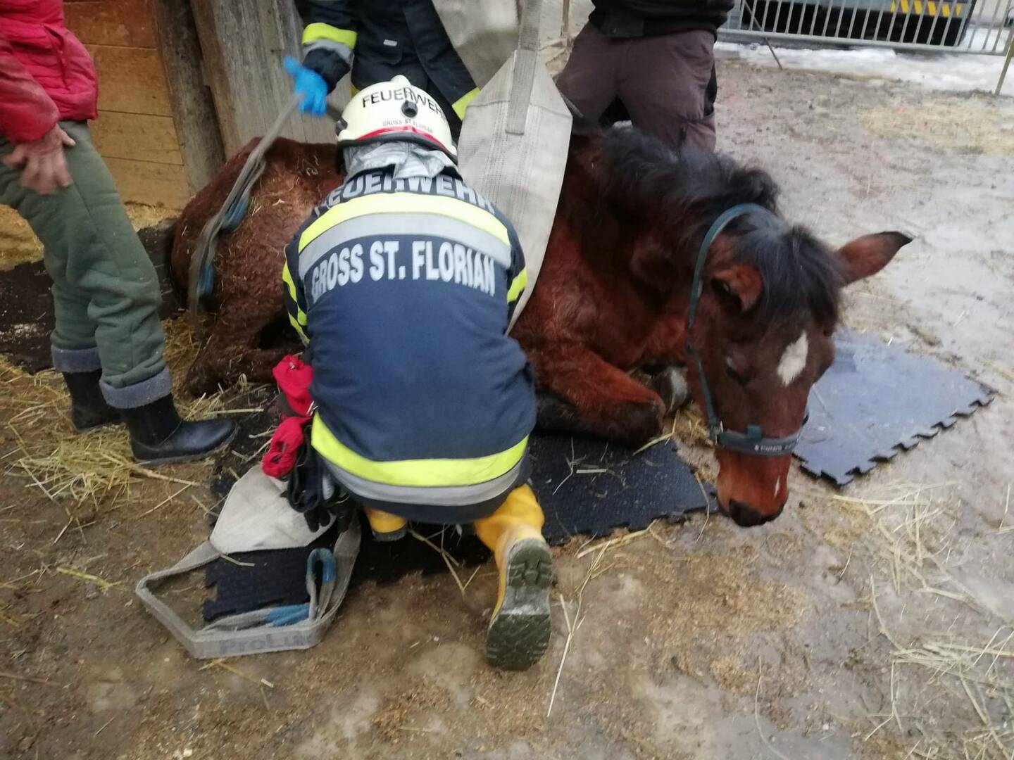 Am Donnerstag, den 01.02.2024 wurde die Feuerwehr Groß St. Florian um 16:00 Uhr zu einer Tierrettung alarmiert. Ein 35 Jahre altes Pferd ist gestürzt und konnte sich nicht mehr selbstständig aufrichten.