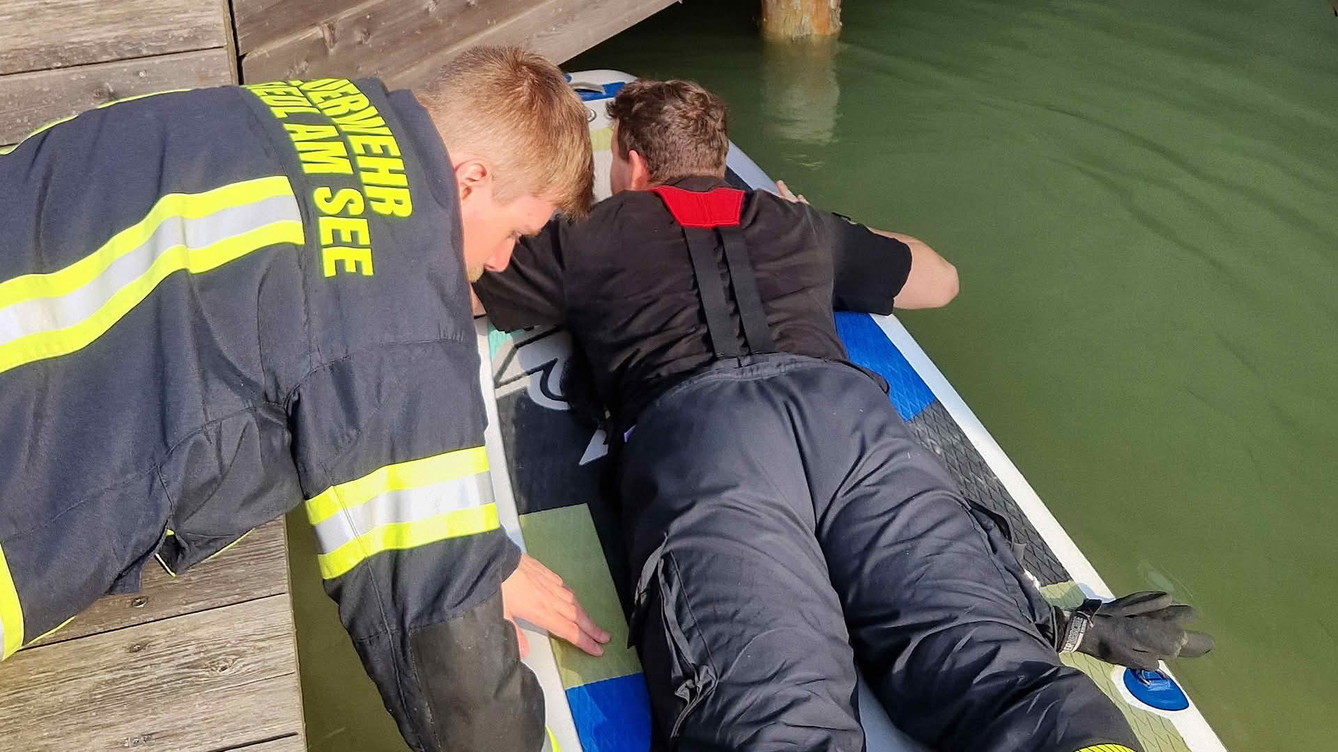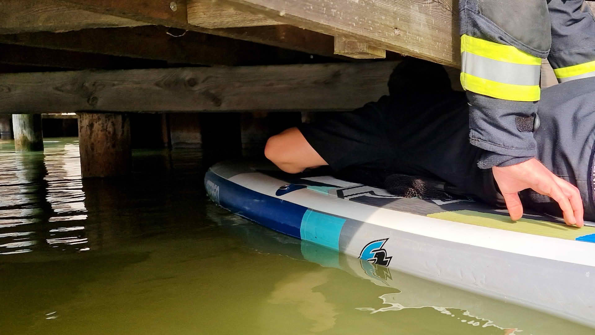 Kurzerhand schnappte sich Feuerwehrmann Adrian ein SUP (Stand Up Paddle), lieĂ sich unter den Steg gleiten und rettete die leicht verĂ€ngstigte Katze unbeschadet aus ihrer misslichen Lage. Die offensichtlich wasserscheue „UnglĂŒckskatze“ zeigte sich im Anschluss dankbar, dass sie – ohne nass zu werden – gerettet werden konnte.