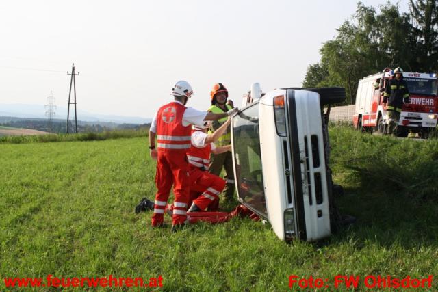 Einsatzleiter HBI Pesendorfer Ernst erkundete gemeinsam mit den Roten Kreuz Mitarbeitern die Lage und stellte rasch fest, dass weitere Einsatzkräfte zur Einsatzstelle alarmiert werden müssen. So wurden um ca. 19:08 Uhr über die Bezirkswarnstelle Gmunden die Feuerwehr Wiesen und die Betriebsfeuerwehr Steyrermühl alarmiert. In der Zwischenzeit wurde eine Umleitung durch Kameraden der Feuerwehr Ohlsdorf und Aurachkirchen eingerichtet, ein dreifacher Brandschutz aufgebaut und das auf der Seite liegende Fahrzeug gesichert.