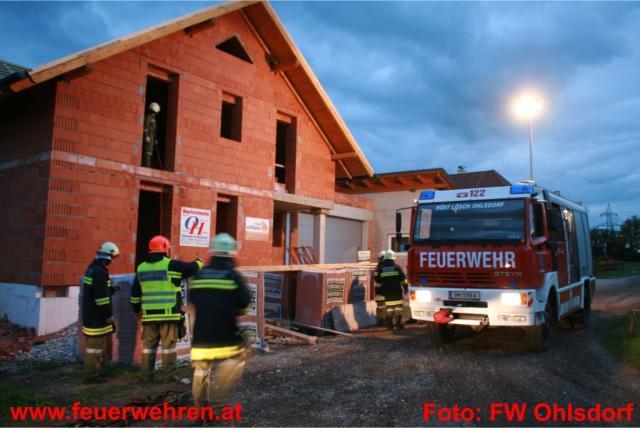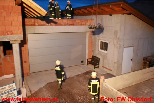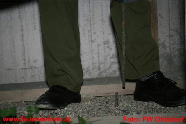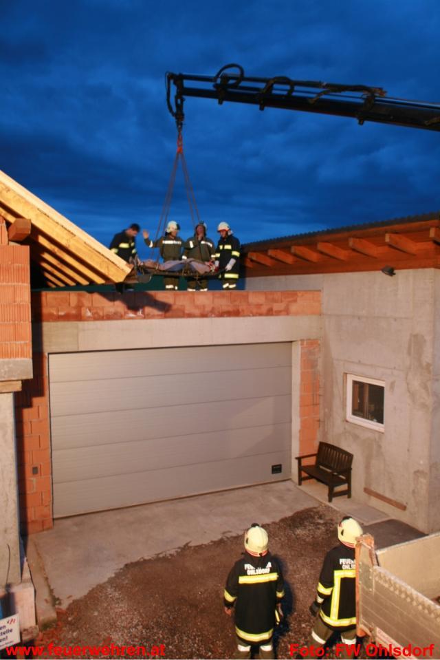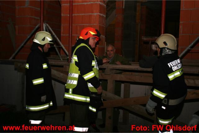 Bei der dieswöchigen Einsatzübung der Feuerwehr Ohlsdorf wurde am Donnerstag, den 16. September 2010 ein Unfall auf einer Baustelle angenommen. Zwei Bauarbeiter waren mit Arbeiten im ersten Obergeschoß beschäftigt. Ein Arbeiter stürzte dabei von einen Gerüst und blieb bewusstlos liegen. Sein Kollege stürzte beim Hilfe holen durch einen Spalt und wurde dabei von einem Baustahlgitter am Fuß aufgepfählt.