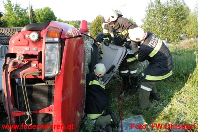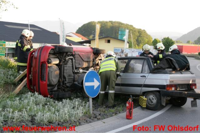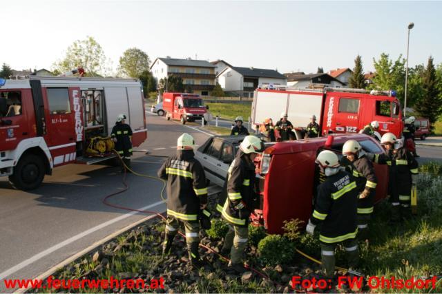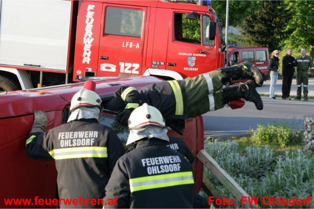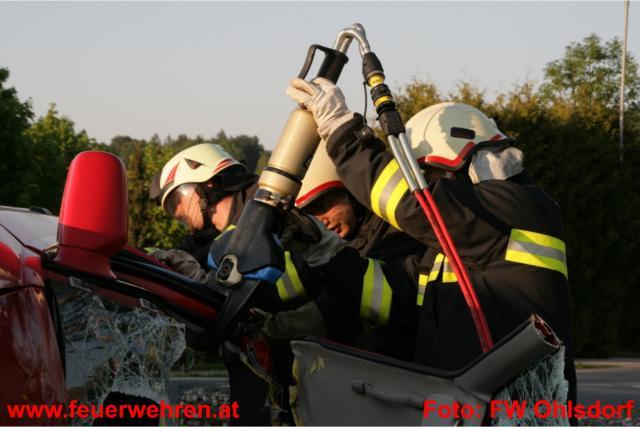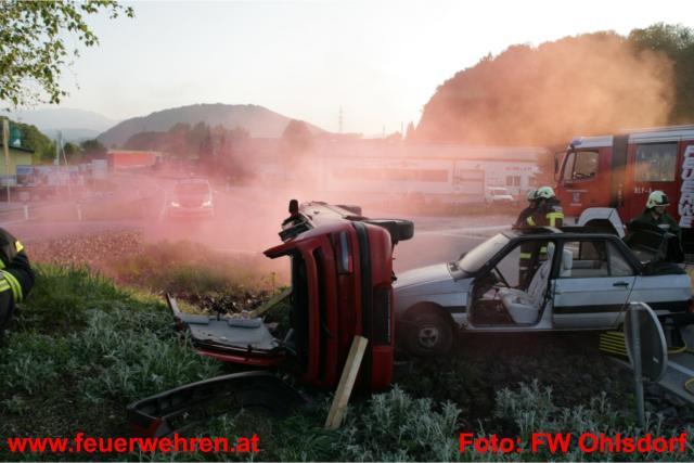Arbeitsintensiv und actionreif, so lief die erste Einsatzübung 2011 der Feuerwehr Ohlsdorf am Donnerstag, den 05. Mai. 2011 ab. Unfallannahme war ein Verkehrsunfall im Kreisverkehr Kleinreith. Ein Pkw-Lenker übersah einen im Kreisverkehr fahrenden Pkw und kollidierte mit diesem so stark, dass dieser seitlich im Straßengraben zum Liegen kam. Insgesamt waren drei Personen in den Fahrzeugen eingeklemmt.