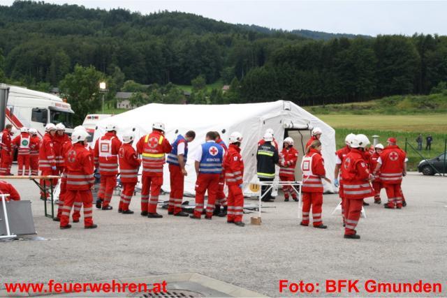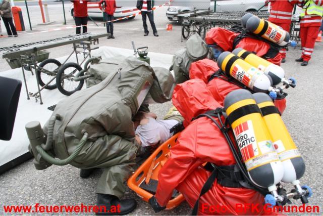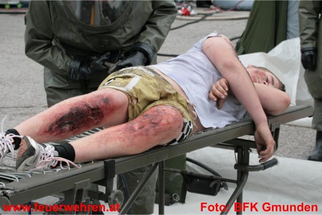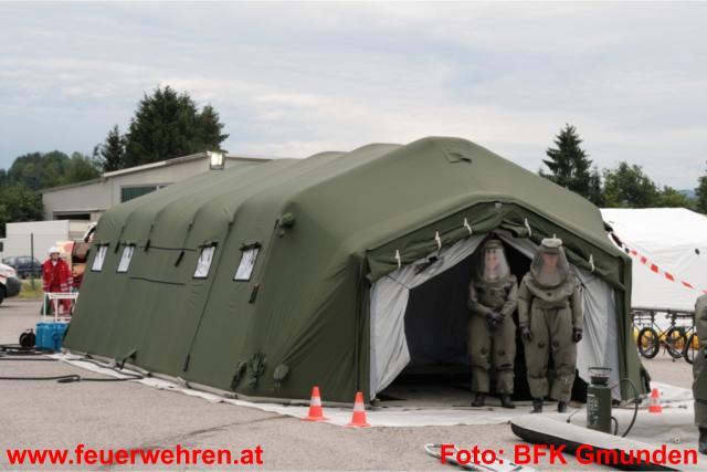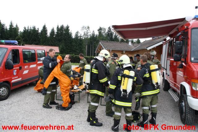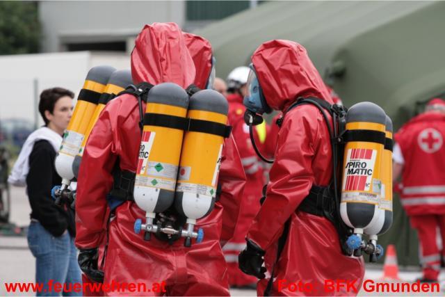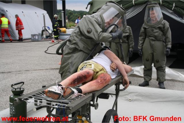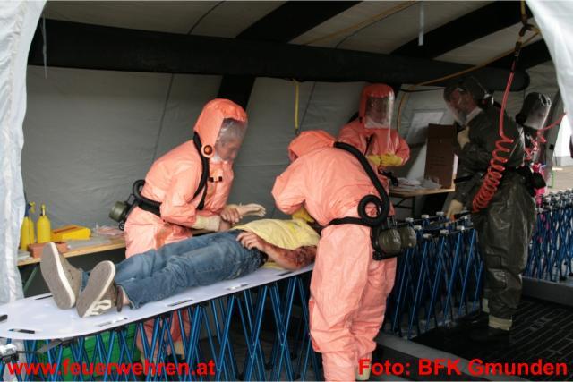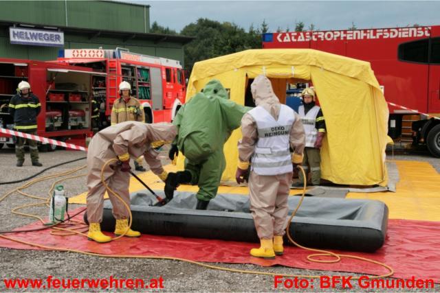 Gleich drei Dekontaminationseinheiten wurden im Laufe der Übung und durch die Alarmierung der Alarmstufe 2 und in weiterer Folge durch Alarmstufe 3 aufgebaut. Dies bedeutete dass 19 Feuerwehren der umliegenden Gemeinden im Übungseinsatz standen. Der Deko-Zug der Berufsfeuerwehr Linz übernahm die Dekontamination der Einsatzkräfte, welche mit Schutzstufe 2 und 3 am Einsatzort in Dienst waren. Das Bundesheer (Dekozug Salzburg) und das Rote Kreuz errichtete bei der Zufahrt zum Übungsobjekt deren Deko-Einheit und übernahm die Dekontamination der verletzten Personen und in weiterer Folge die Erstversorgung. Insgesamt galt es 12 Verletzte zu versorgen und in die verschiedenen Landeskrankenhäuser zu bringen. Hierbei standen 9 Fahrzeuge aus den verschiedensten Dienststellen des Roten Kreuzes zur Verfügung. Die Einsatzkräfte der Feuerwehren zeigten unter erschwerten Bedingungen (Schutzstufe 2 bzw. 3 und Atemschutzgerät) höchste Leistungen und konnten alle gestellten Übungsaufgaben zu vollster Zufriedenheit erfüllen.