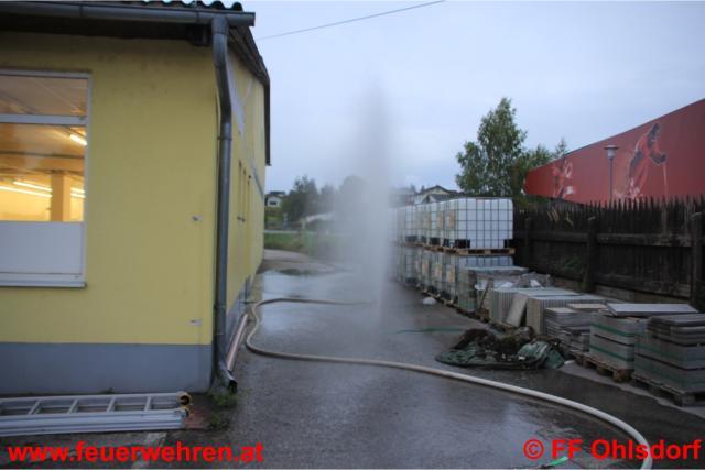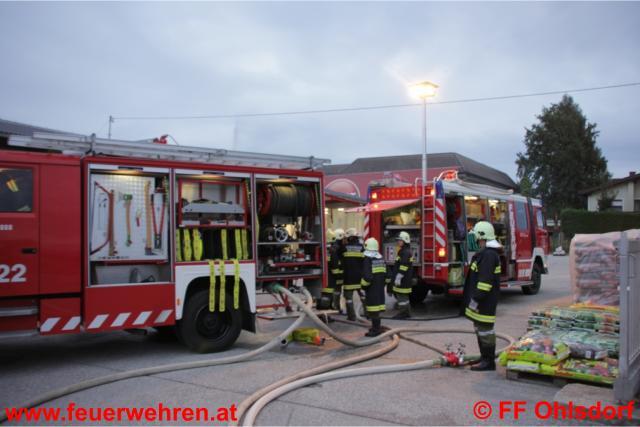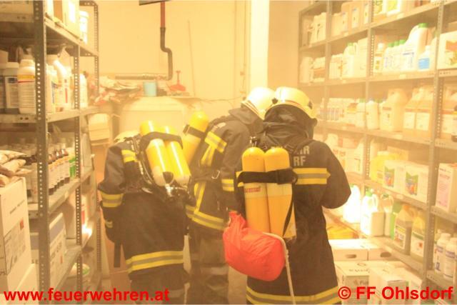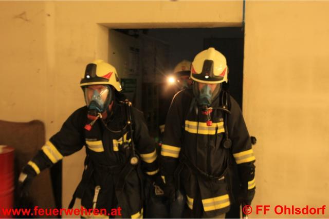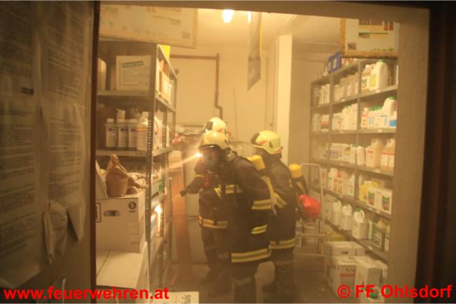 Nach dem Eintreffen der ersten Einsatzmannschaft wurde sofort unter schwerem Atemschutz das alte Verkaufsgebäude des Lagerhauses Ohlsdorf betreten und nach der vermissten Person gesucht. Außen wurde derweilen mit Hilfe eines Hydroschildes und von C- Rohren eine Brandabschottung zu anderen Gebäuden errichtet. Das Löschfahrzeug der Feuerwehr Ohlsdorf verlegte eine Zubringerleitung mit Hilfe des Schlauchcontainers zu einem nahgelegenen Löschwasserbehälter. Dort übernahm Pumpe Aurachkirchen das Ansaugen des Löschwassers mit einer Tragkraftspritze.