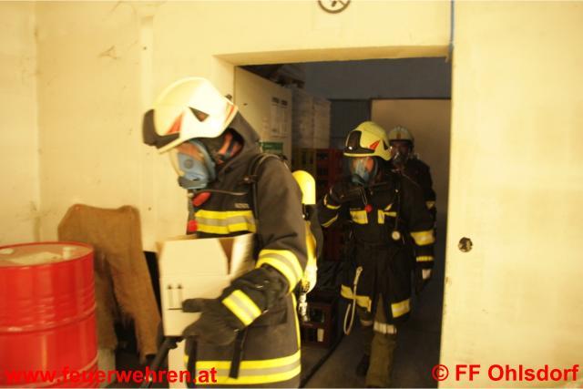 Nach dem die vermisste Person gerettet wurde, musste der Atemschutztrupp noch kleinere Behälter mit leicht brennbaren Gefäßen aus dem Gebäude holen, um so die Gefahr eines plötzlichen weiteren Brandausbruches zu verhindern. Nach dem alle Übungspunkte erfolgreich abgearbeitet wurden konnte die Übung beendet werden. Im Anschluss wurde eine Übungsnachbesprechung durchgeführt und das neue Verkaufsgebäude des Lagerhauses Ohlsdorf besichtigt, um in einem Alarmfall die Gegebenheiten zu kennen.