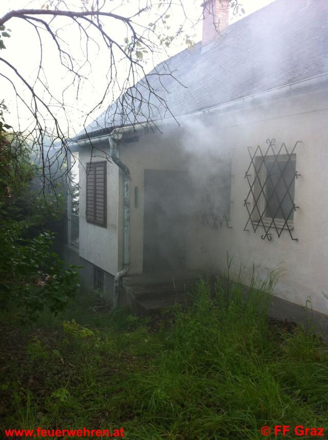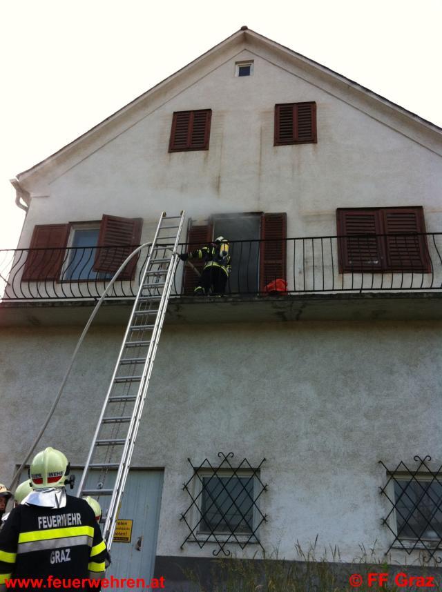 Nach der ersten Erkundung durch den Einsatzleiter Brandmeister Daniel Nemeth und Löschmeister Thomas Scholz wurden einige Schwierigkeiten festgestellt. Der Zugang zum Objekt über die Garage und der Zugang über den Haupteingang waren versperrt und schwer erreichbar. Weiters meldete der Besitzer, dass vier Personen eingeschlossen seien und sämtliche Etagen stark verraucht sind. Da im ersten Obergeschoss eine Balkontüre offen stand, wurde ein Leiterweg hergestellt. Nach dem kompletten Öffnen der Balkontüre drang starker Rauch aus der Wohnung. Die beiden eingesetzten Atemschutztrupps begannen sofort mit der Menschenrettung.