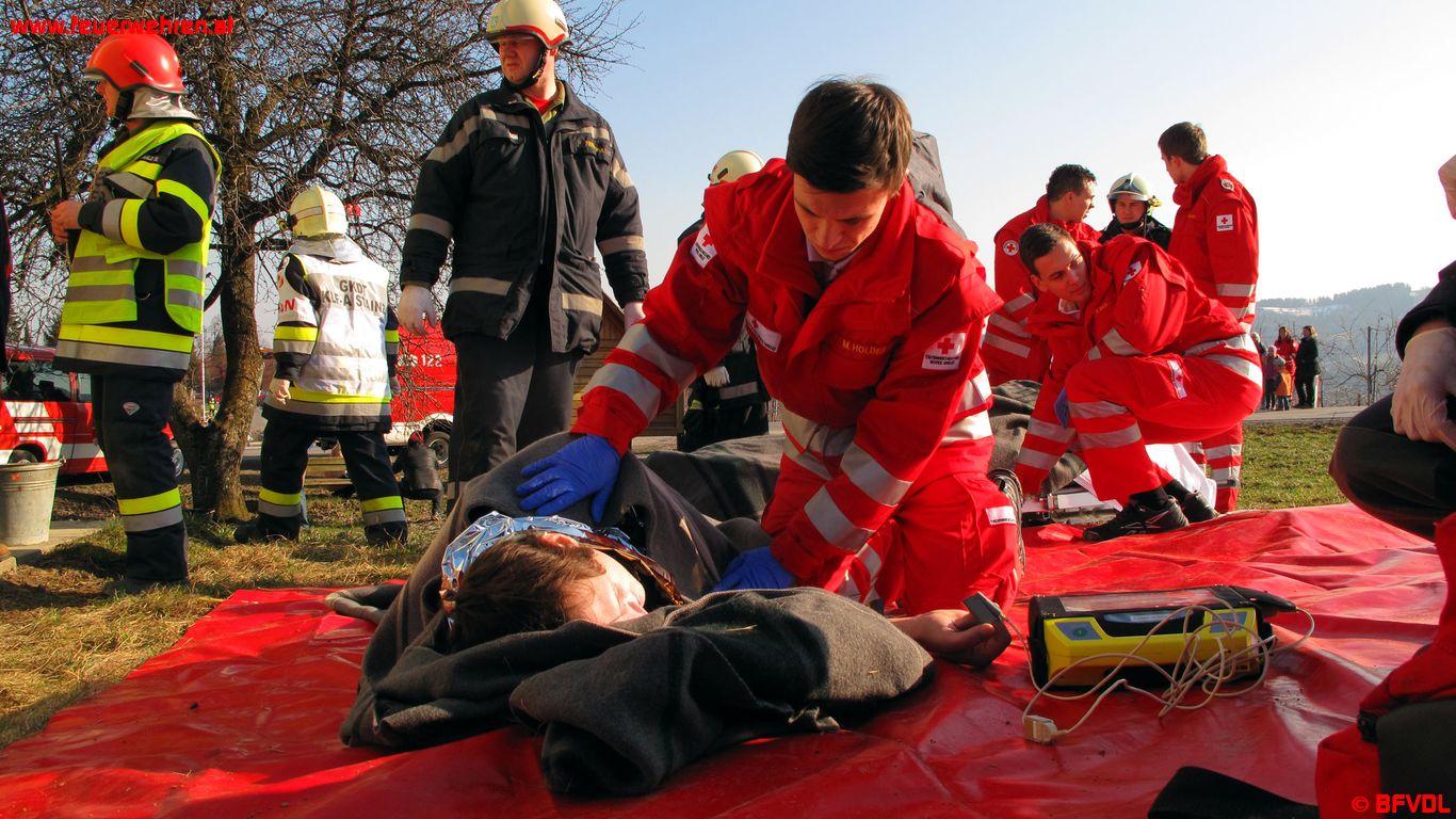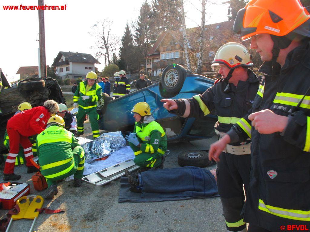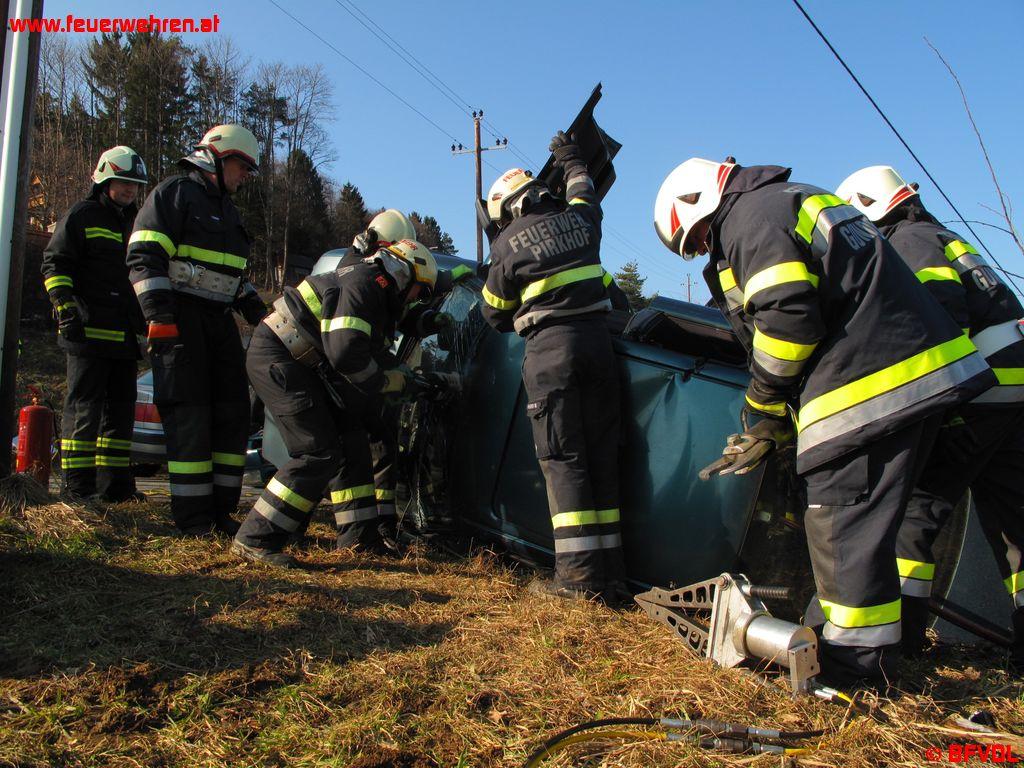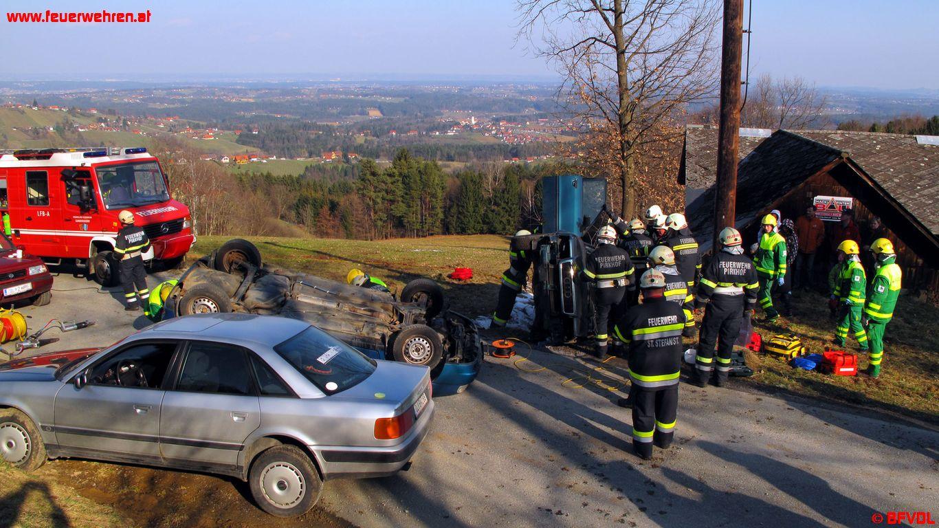Zusätzlich zu diesem Vorfall hat sich auf der unmittelbar nebenbei gelegenen Gemeindestraße ein Verkehrsunfall ereignet. Dieses Übungsszenario wurde mittels einem auf der Fahrerseite liegenden PKW und mehreren in den Fahrzeugen eingeklemmten Personen simuliert. Die Feuerwehren Gundersdorf und Pirkhof bekamen den Befehl den Verkehrsunfall abzuarbeiten. Die eingeklemmten Personen mussten dazu mittels hydraulischen Rettungsgeräten aus den Fahrzeugen gerettet werden.