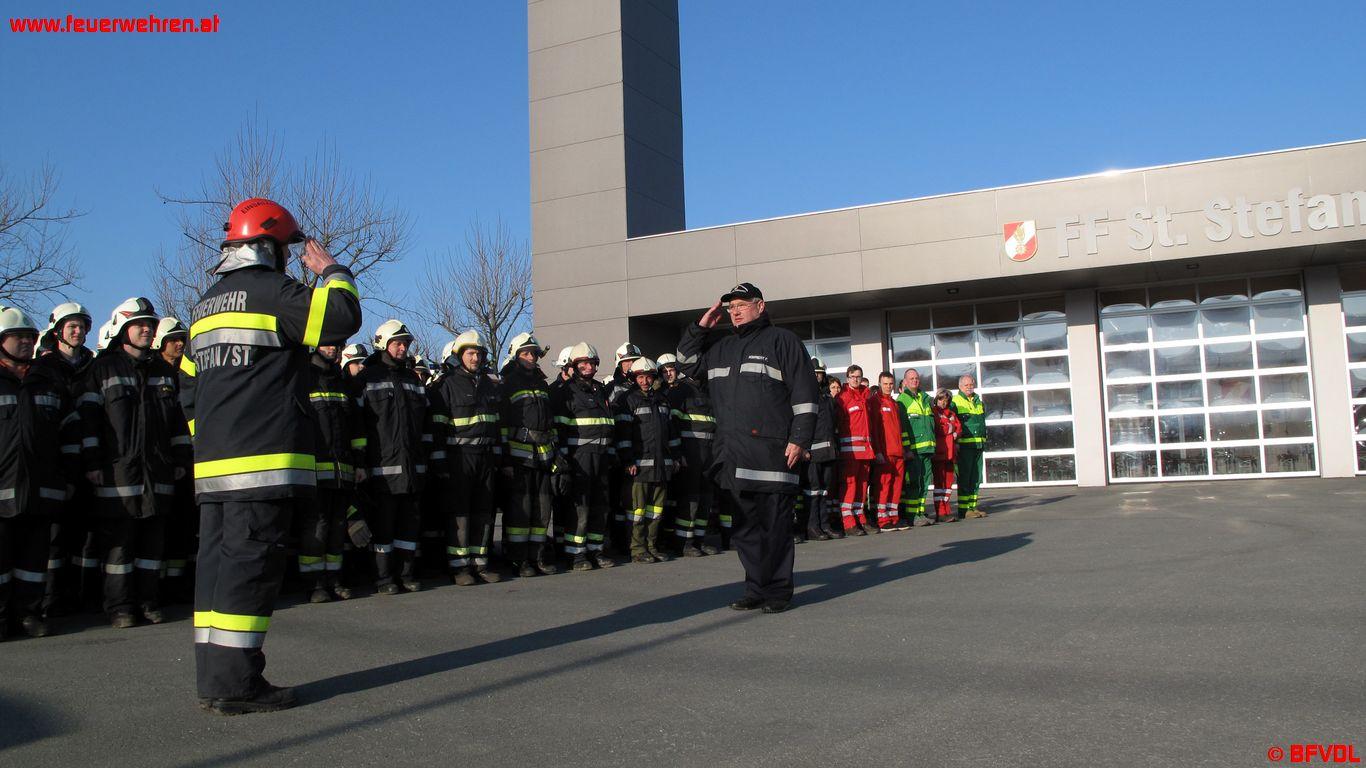 Nach gut zwei Stunden konnte die Übung beendet werden, vorher wurde das Gebäude mittels Überdruckbelüftung wieder rauchfrei gemacht. Neben vielen Bürgern waren auch die Bürgermeister von Greisdorf, Gerhard Eger, von St. Stefan ob Stainz, Ernst Summer und Feuerwehrarzt Dr. Johann Deutschmann am Ort des Geschehens. Bei der Übungsnachbesprechung zeigten sich auch Bereichsfeuerwehrkommandant-Stellvertreter BR Fritz Reinprecht, der Abschnittskommandant ABI Anton Schmidt, ABI d. F. Ing. Friedrich Nechutny sowie BI d. F. Harald Jauk, die als Übungsbeobachter fungierten, mit der durchgeführten Übung sehr zufrieden und lobten das Engagement aller Beteiligten. Dank auch an HBI Stephan Oswald, OBI Gerald Fabian, OBI d. F. Franz Jandl und BI Franz Hiden – sie hatten diese spektakuläre Übung ausgearbeitet. Die Freiwillige Feuerwehr von St. Stefan lud anschließend alle Übungsteilnehmer zu einer Stärkung ins Rüsthaus ein.