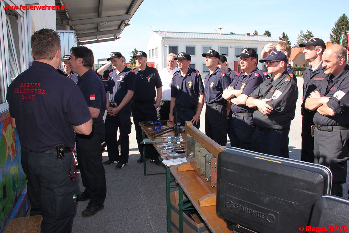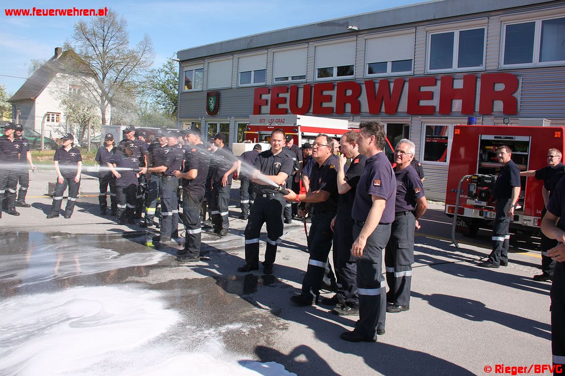 Zum heurigen Praxistag am 24. April kamen rund 150 Feuerwehrmitglieder der 25 Grazer Feuerwehren auf die Wache Süd nach Puntigam. Neben der Berufsfeuerwehr und der Freiwilligen Feuerwehr gibt es in Graz 23 Betriebsfeuerwehren, die in diversen Unternehmen für den Brandschutz verantwortlich sind.