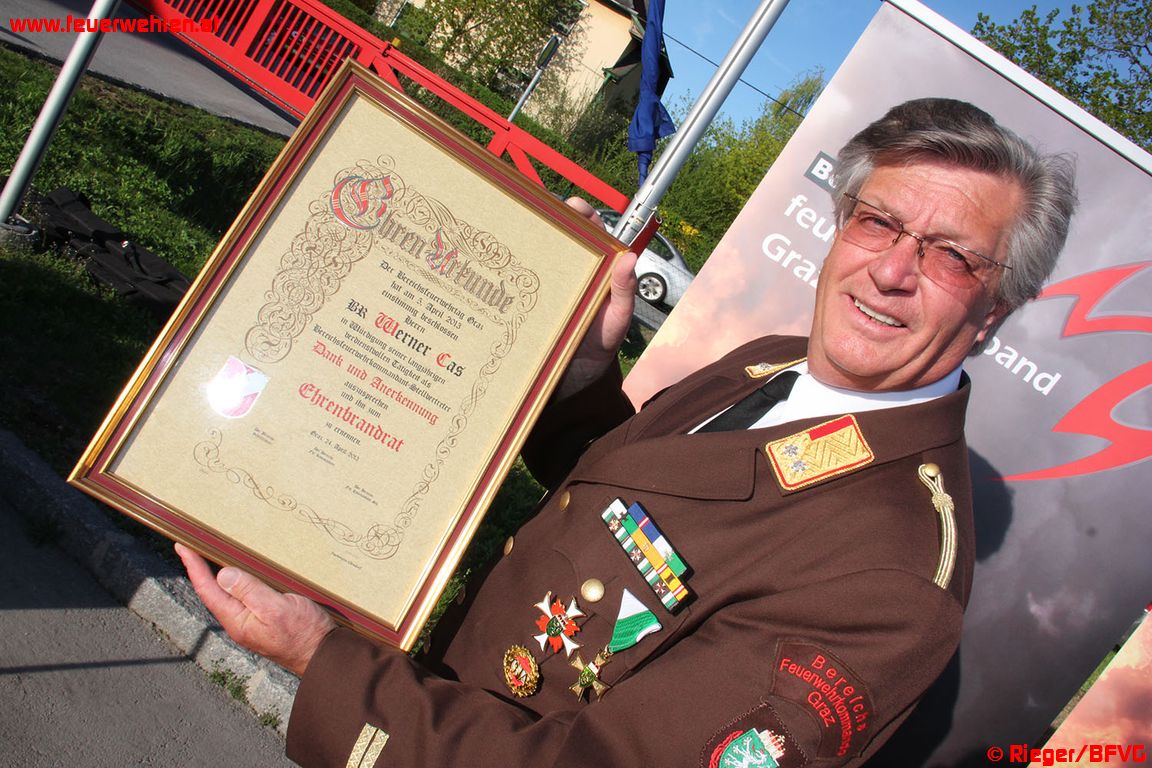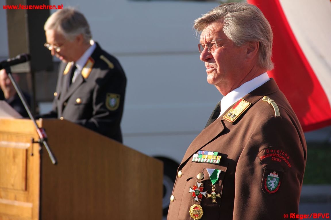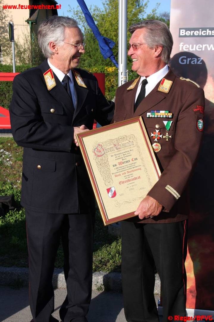 Im Anschluss an den Praxistag folgte ein Festakt zur Verabschiedung des scheidenden Bereichsfeuerwehrkommandant Stellvertreter Brandrat Werner Cas. In einer Ansprache dankte Meisenberger seinem ehemaligen Vize und verlieh ihm den Dienstgrad „Ehrenbrandrat“. Anschließend wurden Ehrengeschenke der Grazer Feuerwehren übergeben.