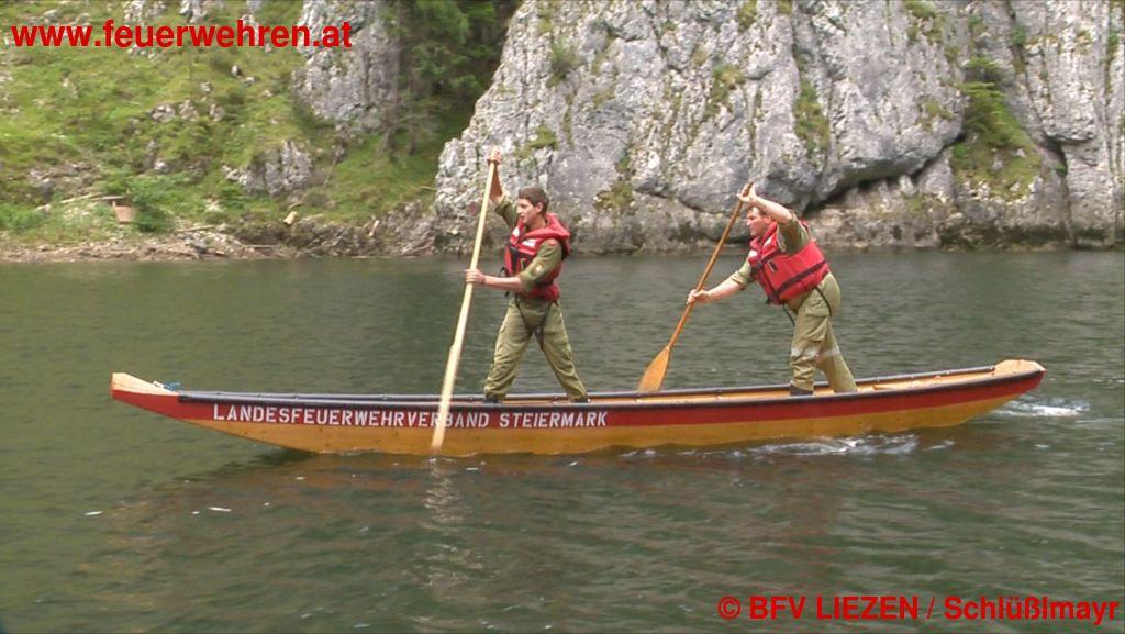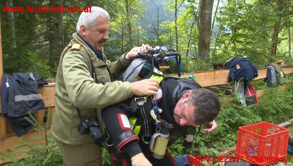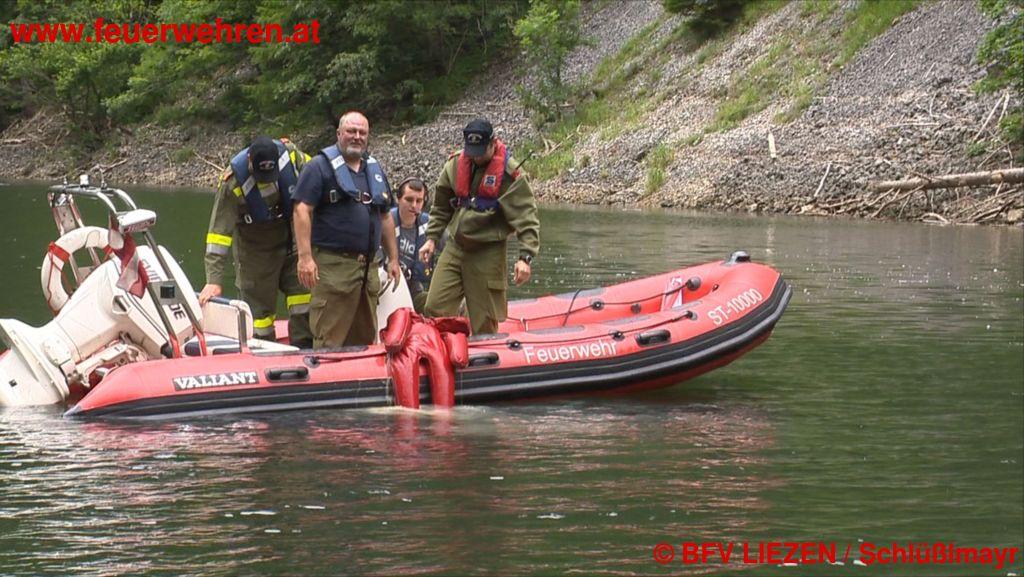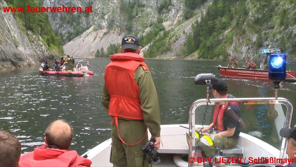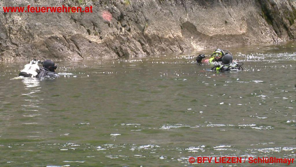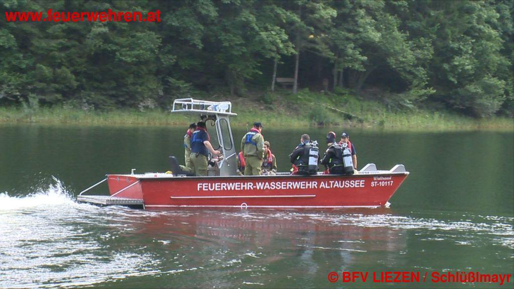 Eine Radfahrerin kommt vom Weg ab und stürzt über die felsige Uferböschung in den Salzastausee. Ein Augenzeuge setzt sofort einen Notruf ab. Die Bezirkswarnzentrale „Florian Liezen“ alarmiert daraufhin die ortszuständige Feuerwehr Neuhofen sowie die Wasserdienst-Stützpunktfeuerwehren Altaussee, Gössl, Grundlsee, Rottenmann und Aich mit Booten, Zille und Tauchern. Die Zille der FF Aich wurde von der FF Gröbming zum Einsatzort transportiert und mittels LKW-Kran zu Wasser gelassen.
