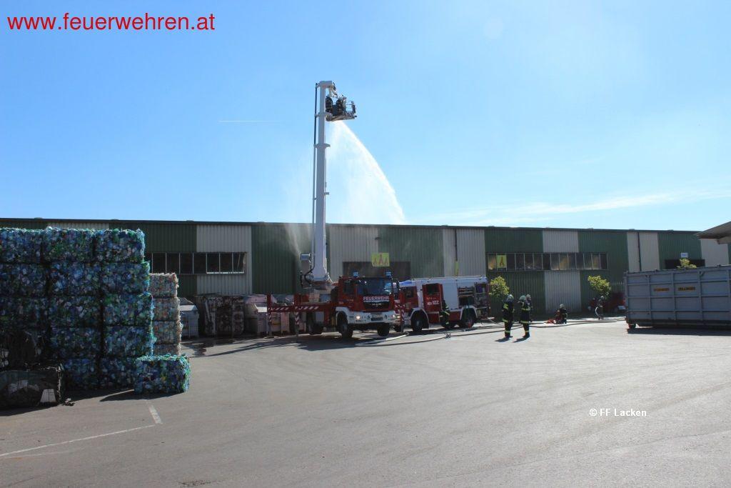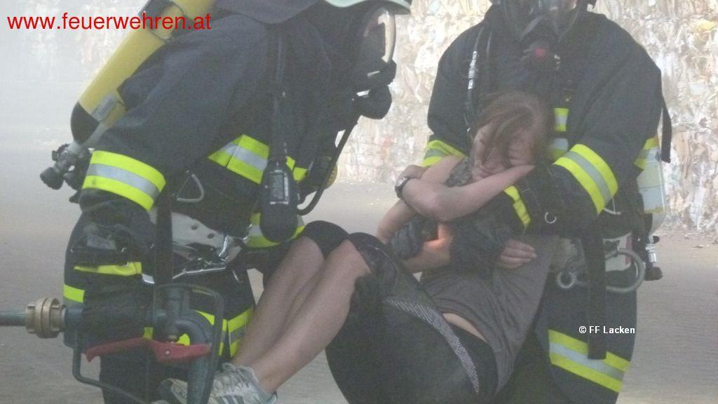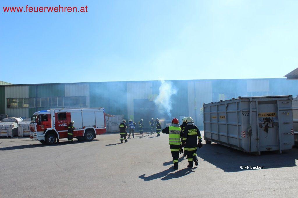 Bei einer Lageerkundung durch den Einsatzleiter, wurde neben den Brand auch der realistisch nachgestellte Verkehrsunfall mit 2 eingeklemmten Personen aufgefunden. Somit teilte der Einsatzleiter den Einsatz in Abschnitte auf, um rasch an allen Orten helfen zu können. Nach der Bekämpfung der tatsächlich brennenden Papiercontainer vor der Papiersortierhalle wurde umgehend ein Innenangriff von einem Atemschutztrupp vorgenommen, um die vermissten Personen in der Halle zu retten. Die Herausforderung bestand darin, die zehn vermissten Personen in der mittels Nebelmaschine stark verrauchten Halle aufzufinden, sowie die Rettung einer Person von einem Radlader mit Atemschutz.