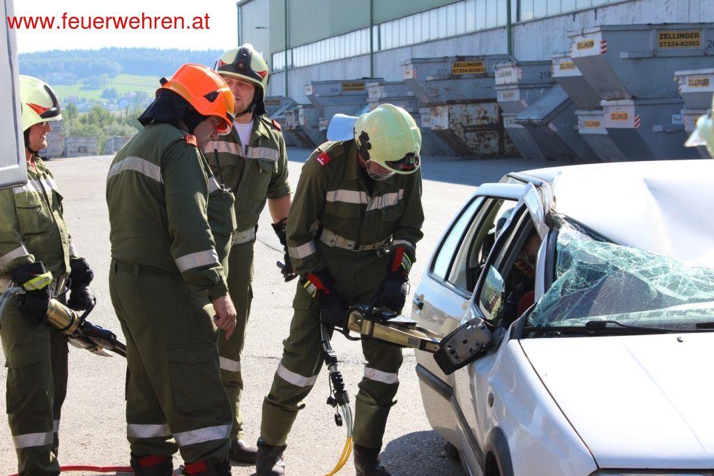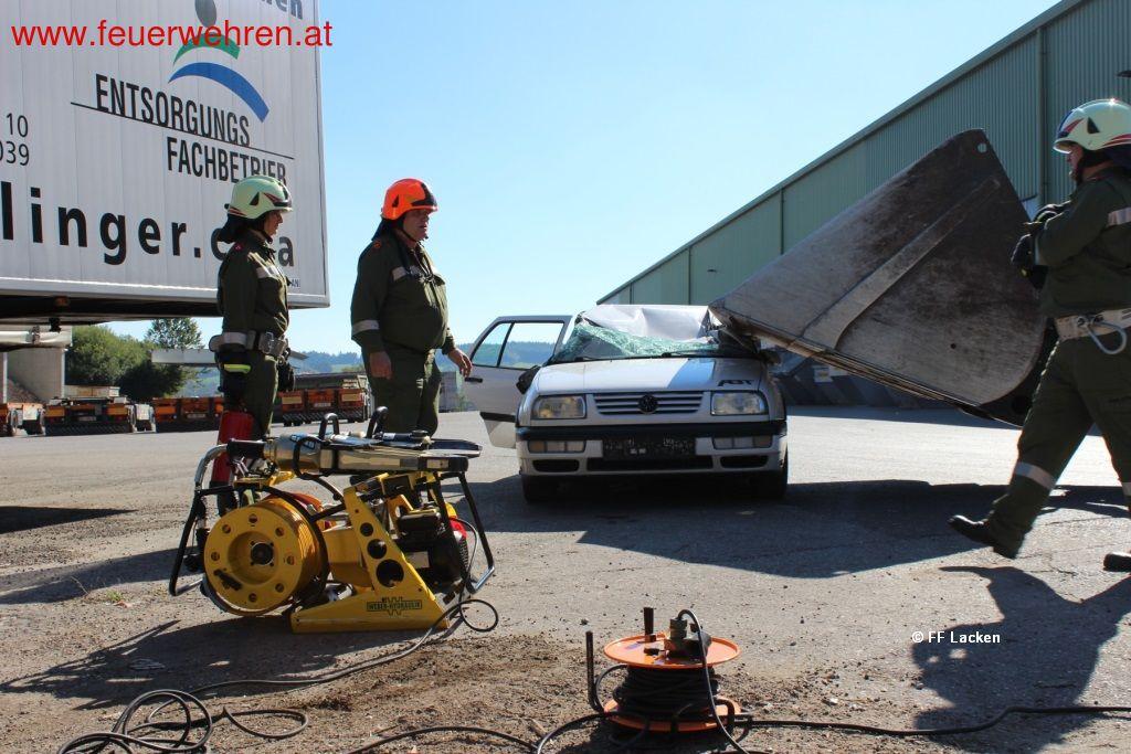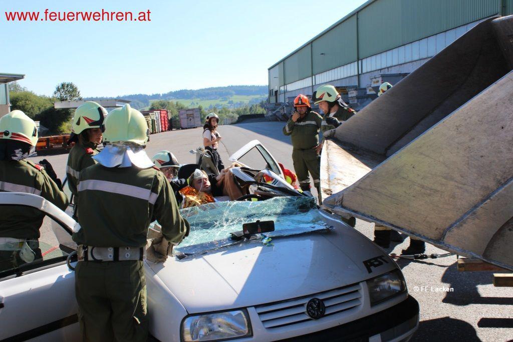 Eine weitere Herausforderung war, dass die Fahrzeuge durch den Verkehrsunfall den direkten Weg zur Löschwasserentnahme versperrten. Somit musste die Anfahrt über einen alternativen Weg organisiert werden. Des Weiteren wurde der Umgang mit einem Ausfall einer Pumpe erprobt. Gleichzeitig mit den Löscharbeiten begann eine Feuerwehr mit der Befreiung der eingeschlossenen Personen im PKW. Dieser kollidierte mit einem Radlader, wodurch das Auto unter die Schaufel des Radladers gedrückt wurde. Erst durch das Anheben der Laderschaufel mittels Hebekissen wurde der Zugang zum Fahrzeug ermöglicht. Danach erfolgte eine schonende Rettung der Personen mit hydraulischem Rettungsgerät.