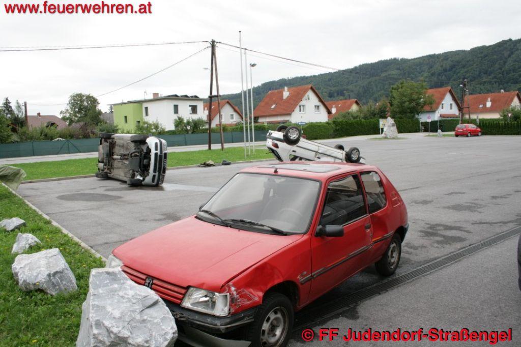 Ein PKW prallte gegen ein Hindernis, eine Person sollte daraus gerettet werden, so stellte sich die Szene eins dar. Ein Fahrzeug am Dach hatte im Fall zwei eine Übungspuppe in sich verborgen, die unter den gegeben Umständen, mit den vorhandenen Mitteln über das Heck befreit werden wollte. Wieder mit einem lebenden Darsteller bestückt, lag ein drittes Wrack auf der Fahrerseite. Erst nachdem das Dach geöffnet war, konnte der Patient aus dem Fahrzeug befreit werden.