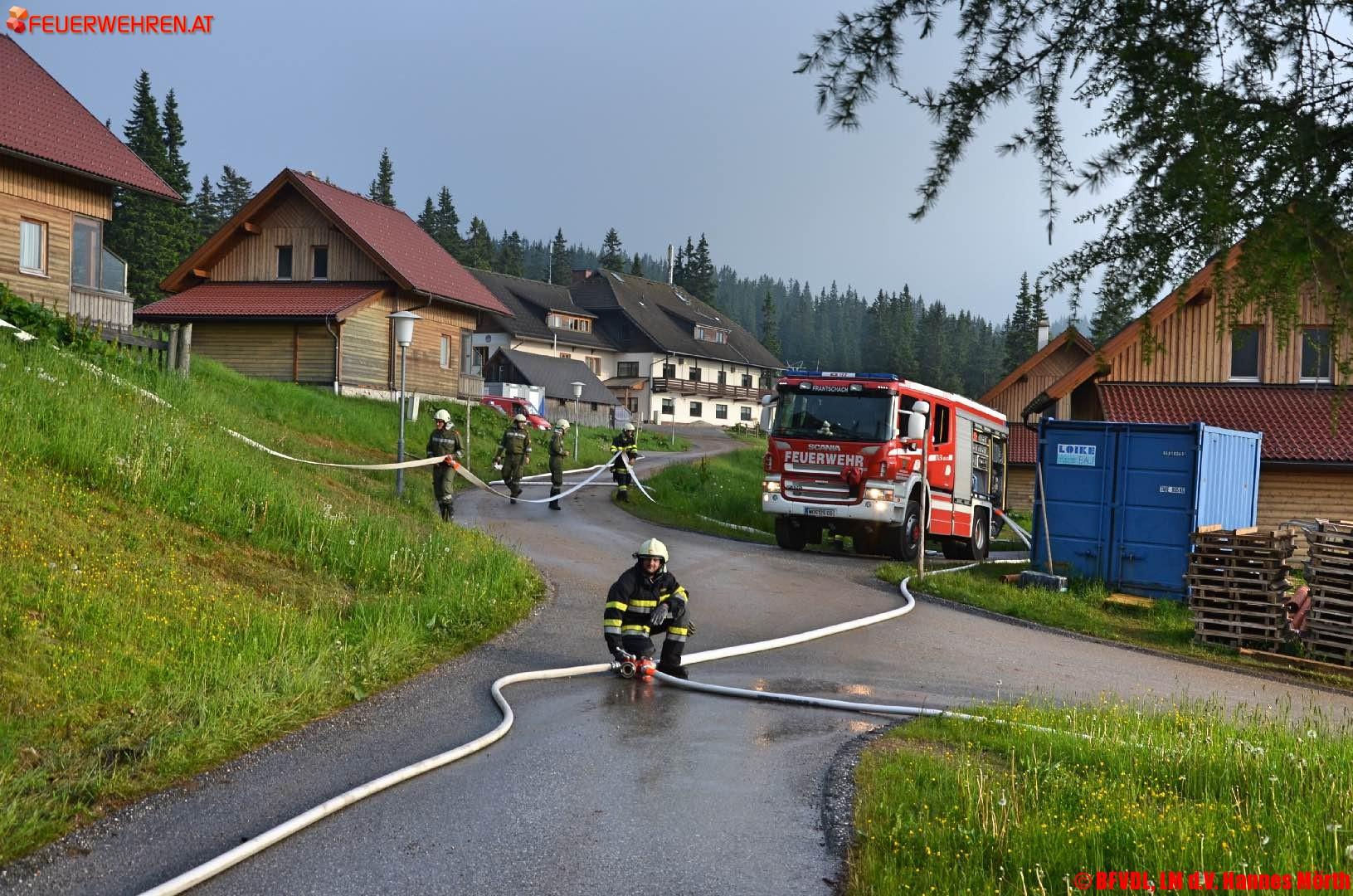 Nach der Alarmierung begann das TLFA400/200 der FF Frantschach und das KLFA Kamp mit dem Erstangriff von der Südseite. Die Aufgabe bestand darin auch die umliegenden Ferienhäuser zu schützen. In weiterer Folge wurde die FF Glashütten und die FF Trahütten alarmiert, welche von der Nordseite zufuhren und dort den Löschangriff starteten und ebenso weitere umliegende Ferienhäuser schützte. Die Wasserversorgung wurde durch 2 Hydranten, welche sich am Gelände der Ferienhäuser befinden sichergestellt.