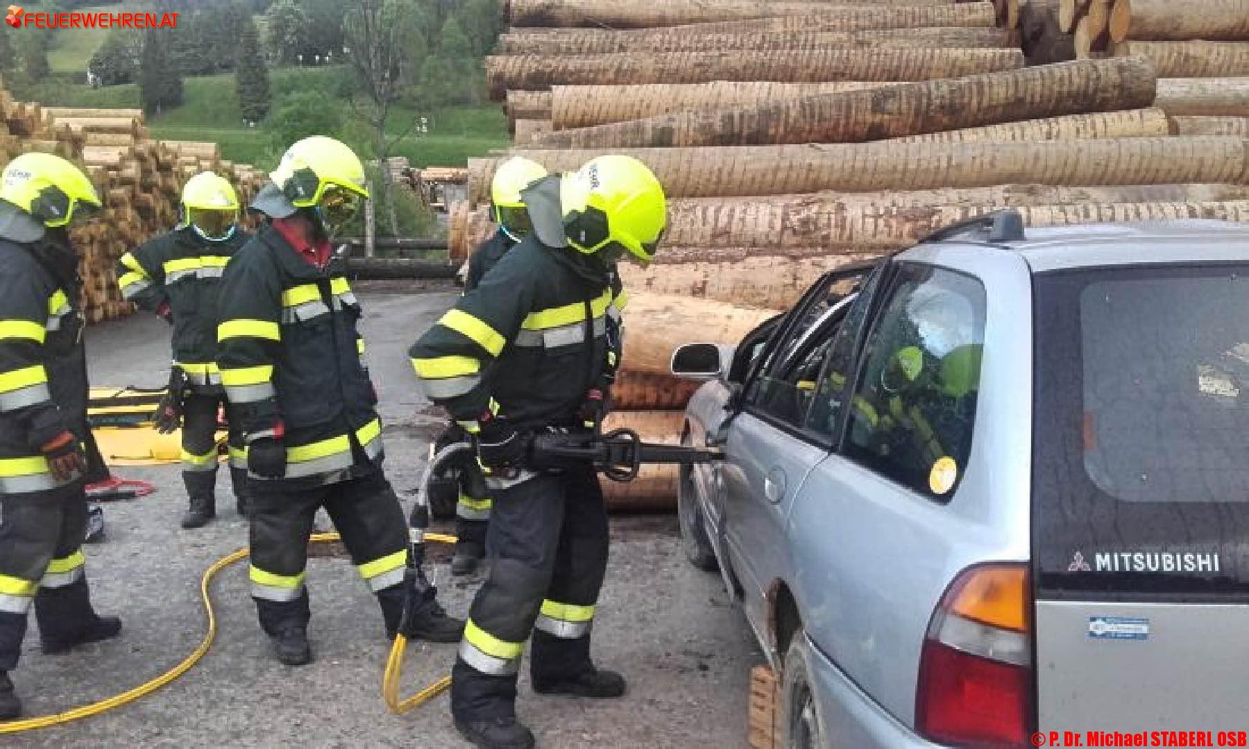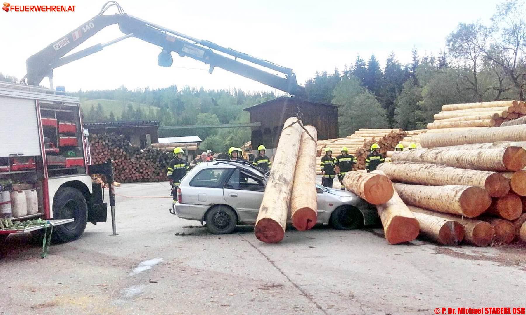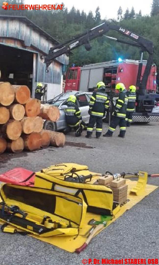 Als Übungsvorgabe diente ein angenommener schwerer Verkehrsunfall im Gelände des Sägewerkes Kaml & Huber in der Rasing. Ein PKW ist in einen Stapel schwerer Rundhölzer gefahren, einige haben sich gelöst und den Lenker im Fahrzeug eingeklemmt.