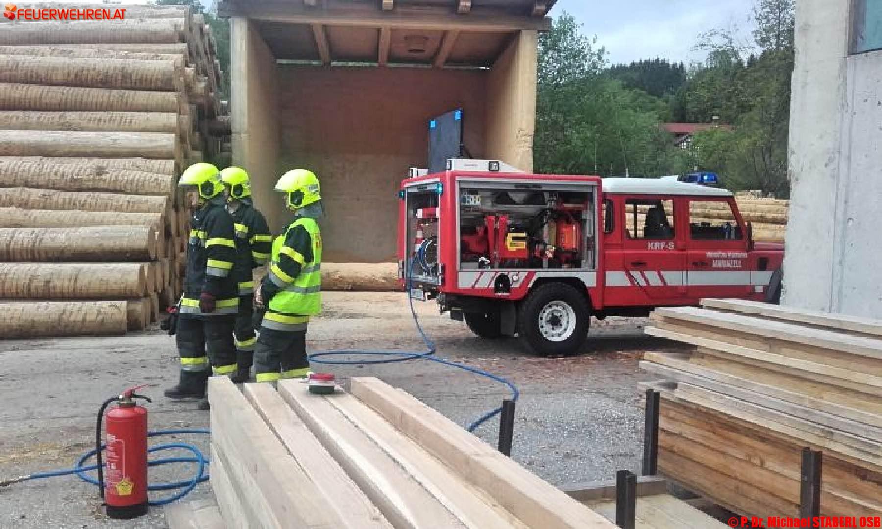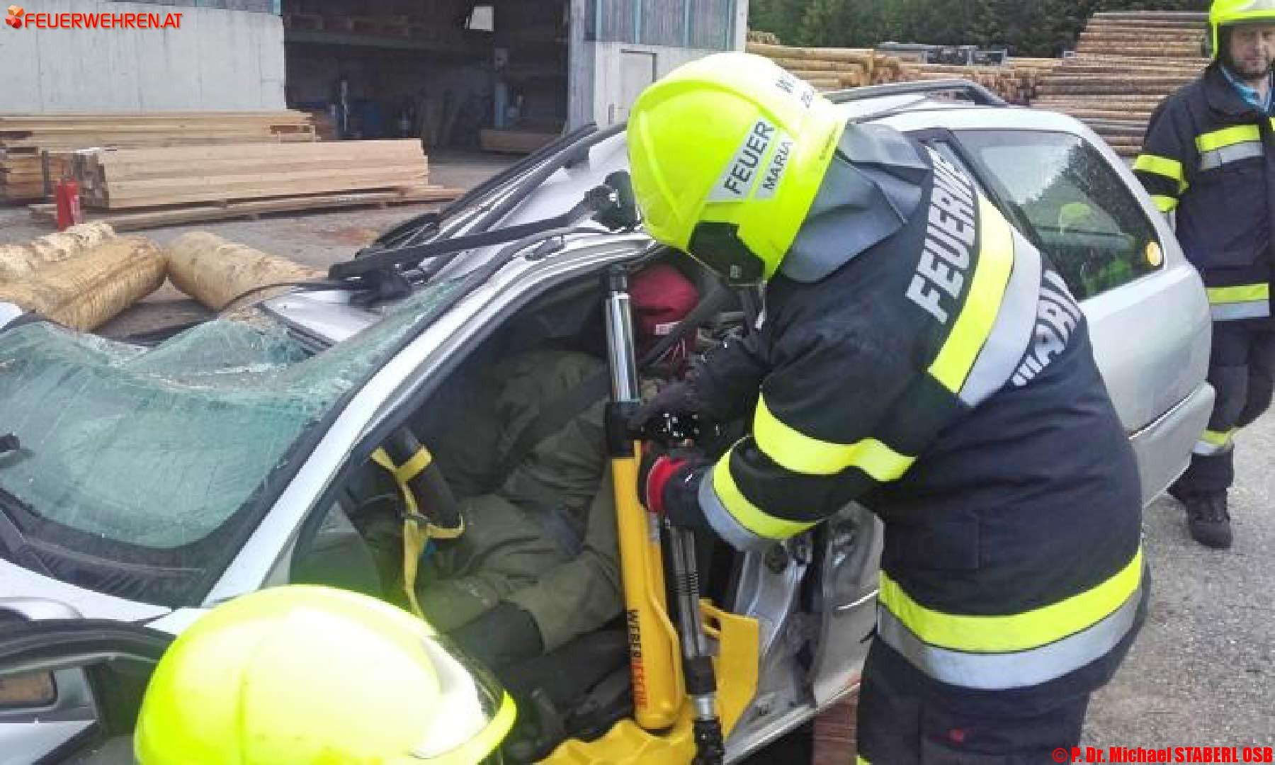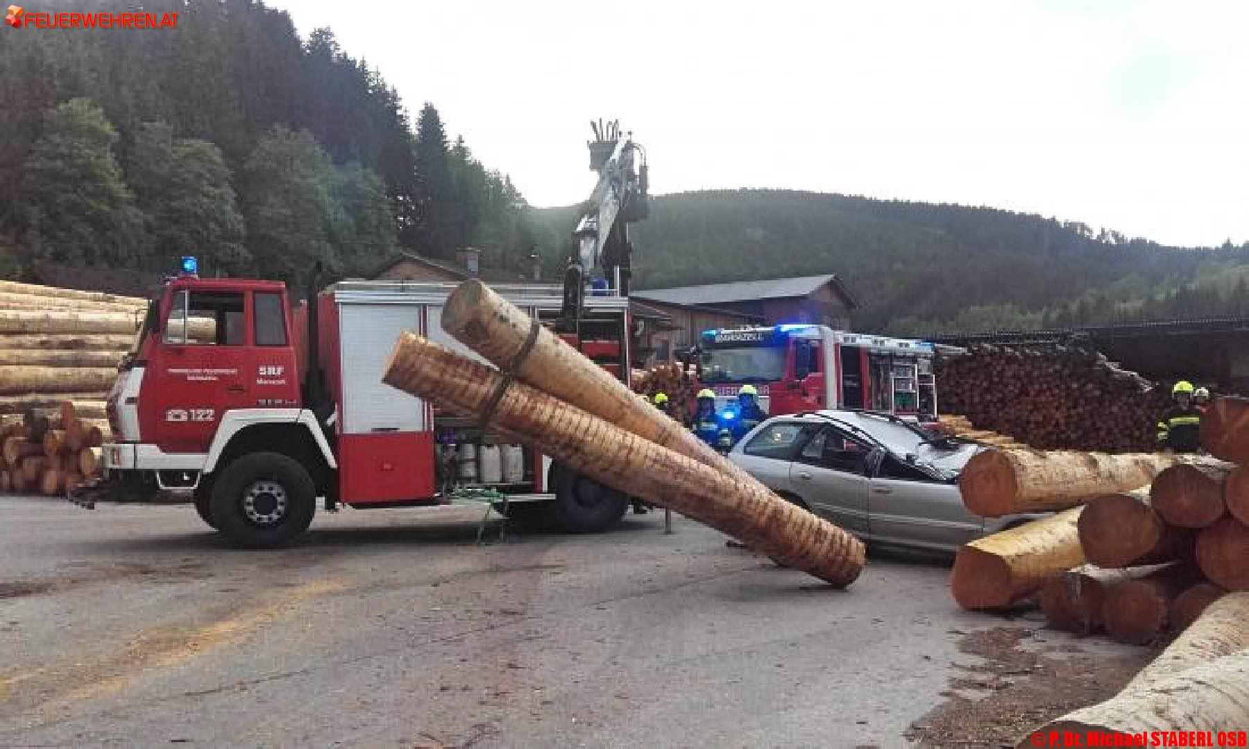 Als Übungsvorgabe diente ein angenommener schwerer Verkehrsunfall im Gelände des Sägewerkes Kaml & Huber in der Rasing. Ein PKW ist in einen Stapel schwerer Rundhölzer gefahren, einige haben sich gelöst und den Lenker im Fahrzeug eingeklemmt.