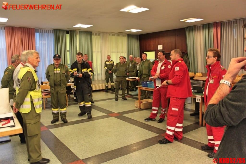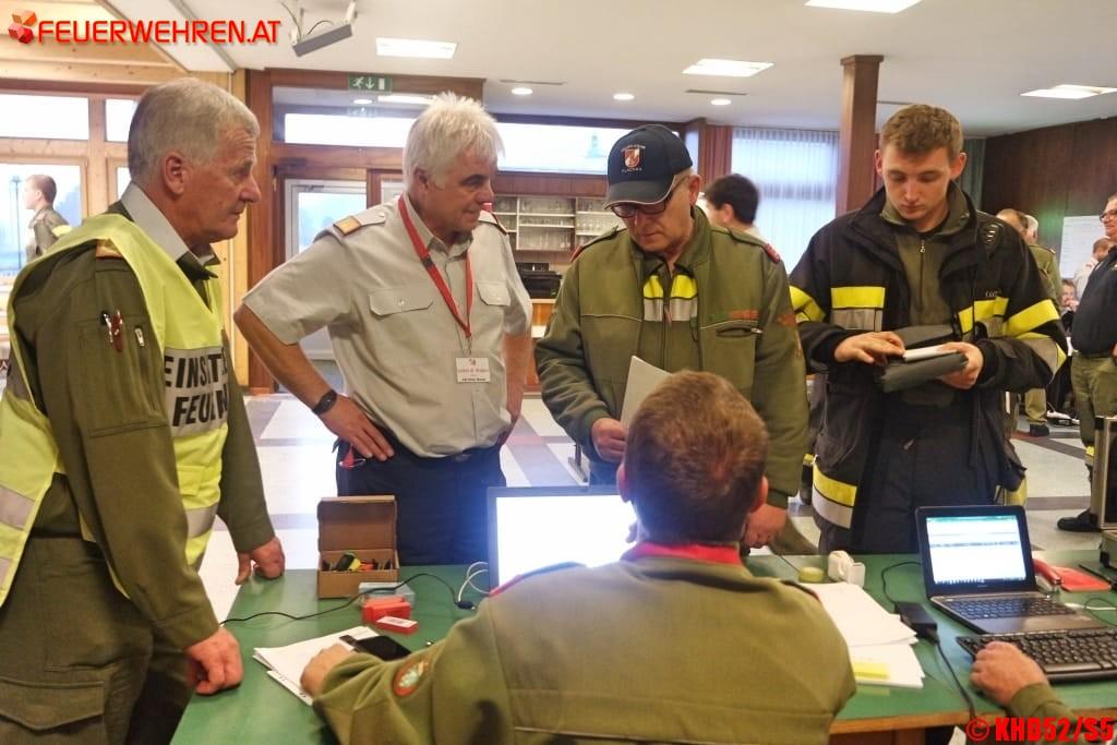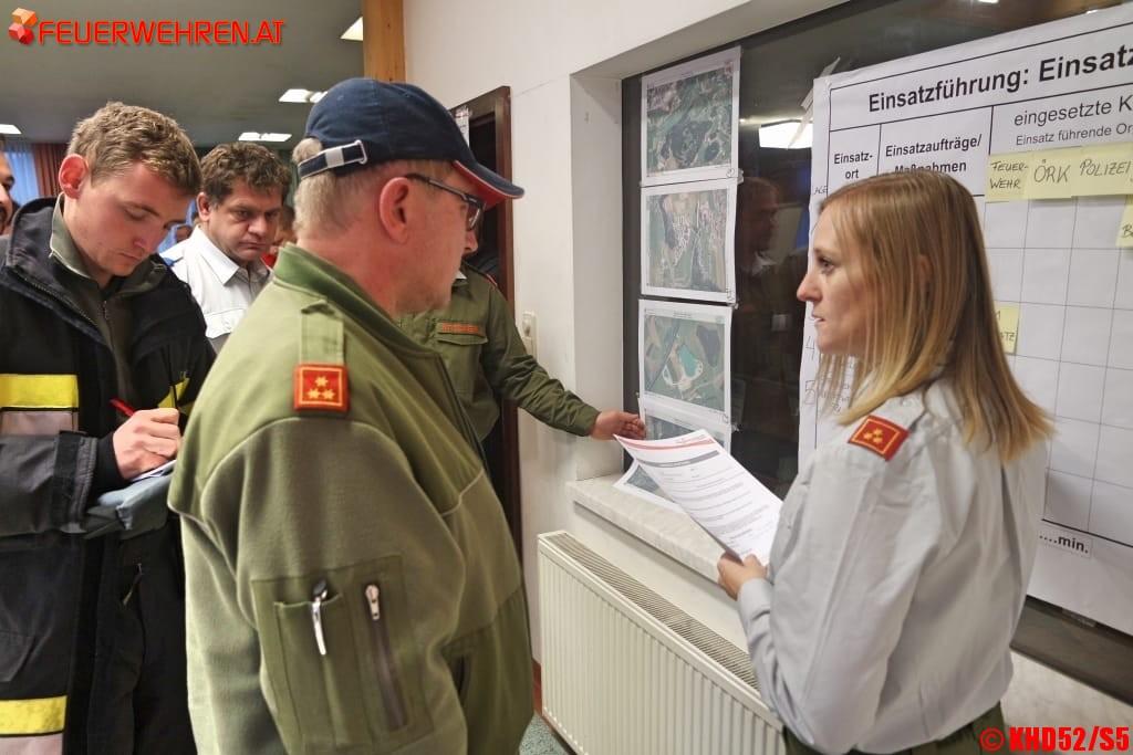 Um 06:30 Uhr hat der 30-köpfige Bereichsführungsstab seine Arbeit wieder aufgenommen, nach kurzer Lagebesprechung wurden die eintreffenden Zugskommandanten nach und nach in die Schadenslagen eingewiesen.