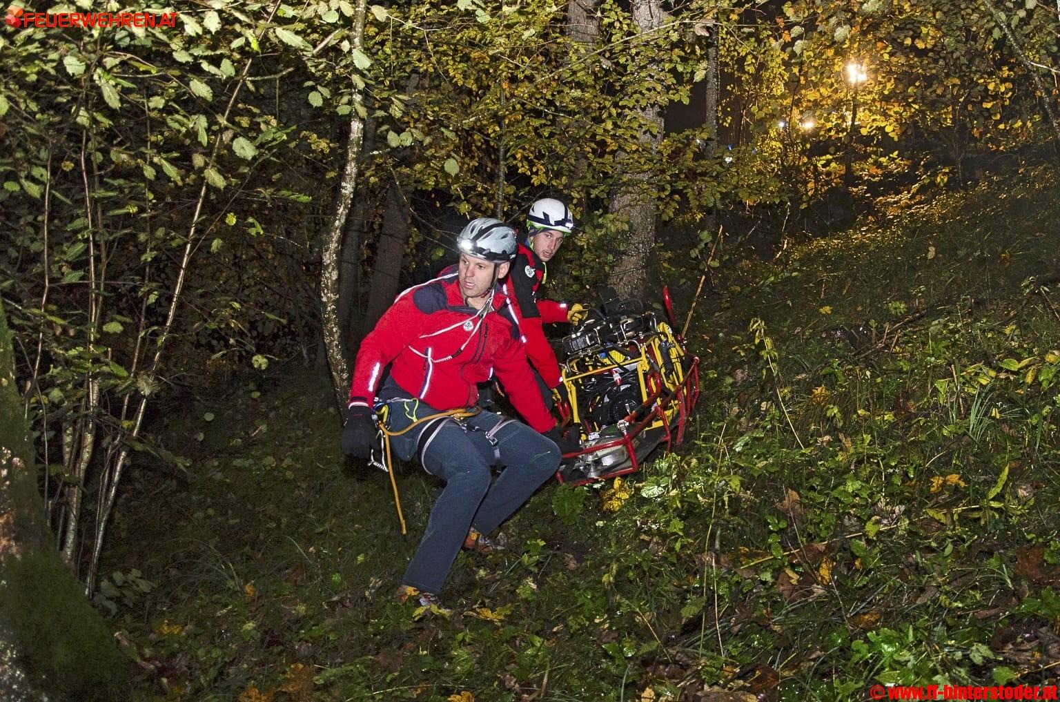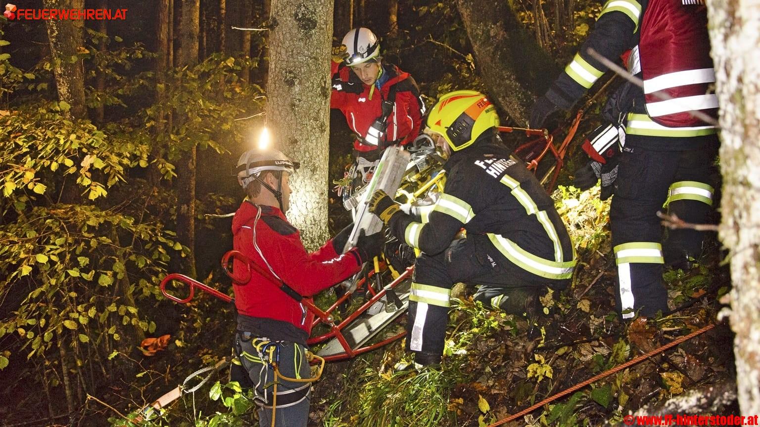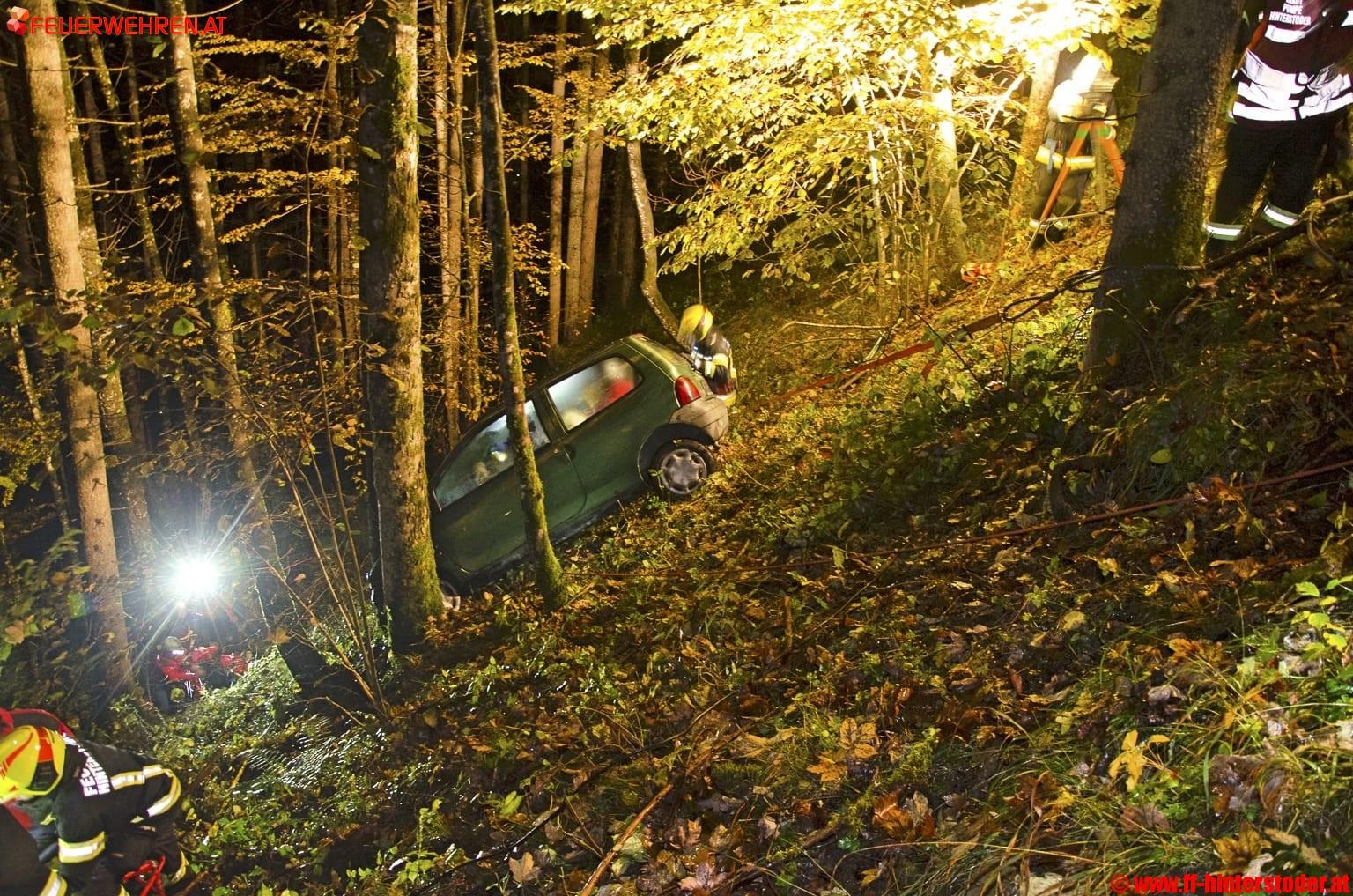 Ein Auto war bei der Talfahrt von der Straße abgekommen und in den angrenzenden Wald gestürzt. Zwei Insassen waren im Fahrzeug eingeschlossen, eine dritte Person wurde aus dem Fahrzeug geschleudert.