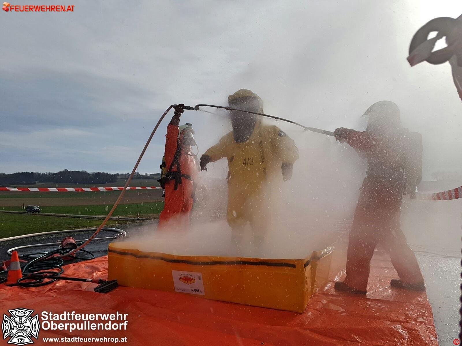 Ein LKW-Unfall mit Austritt einer unbekannten Flüssigkeit wurde für den Gefährlichen-Stoffe-Zug, bestehend aus Mitgliedern des ganzen Bezirkes, angenommen. Unter schwerem Atemschutz wurde der LKW Fahrer gerettet und dem Roten Kreuz zur medizinischen Versorgung übergeben. Nach Errichtung des DEKO-Platzes wurde unter Schutzstufe Drei (Gelbe Anzüge) die ausgetretene Flüssigkeit aufgefangen und umgepumpt.