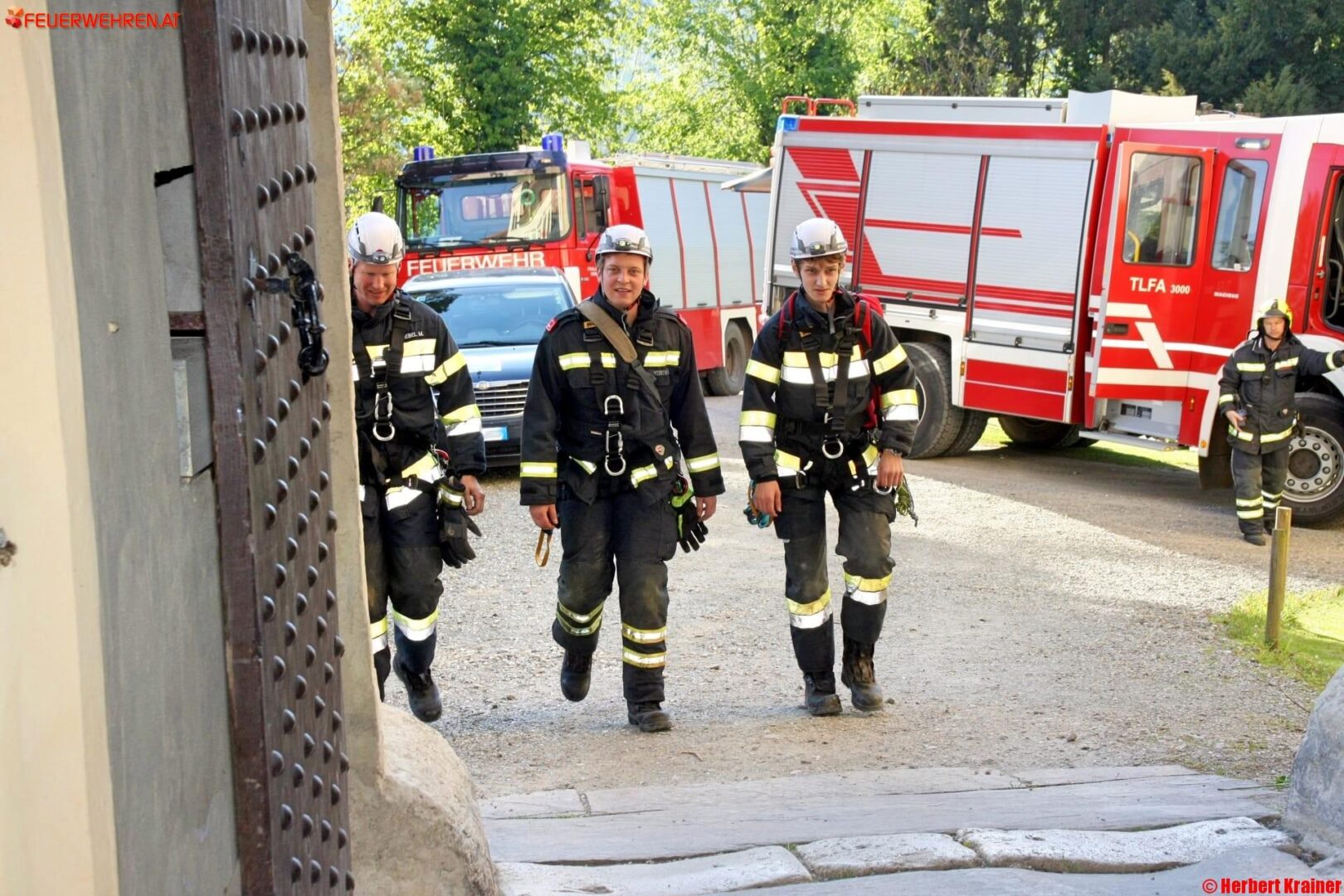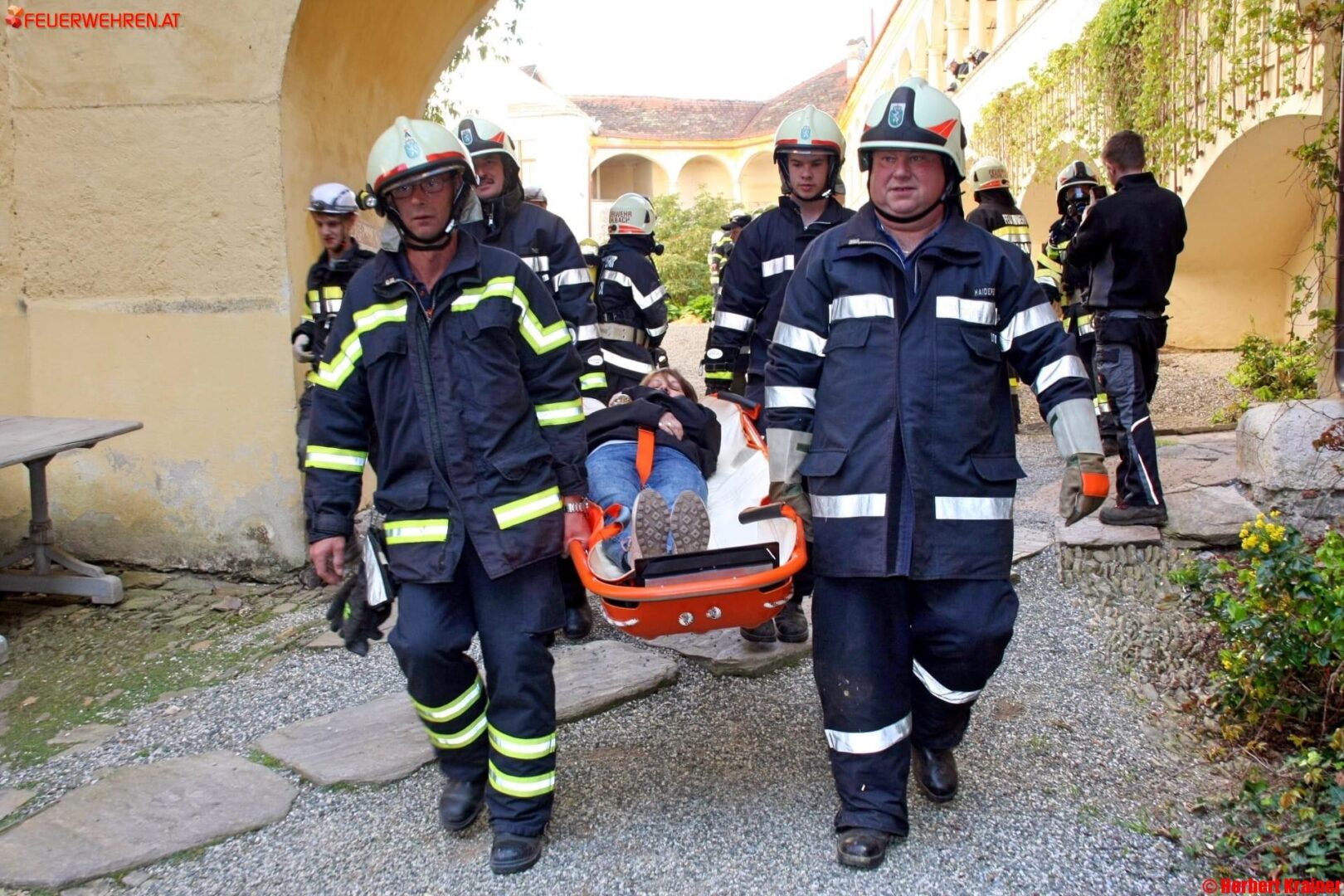 Die Feuerwehr Hollenegg begab sich unter schweren Atemschutz in das Innere des Schlosses und machte sich auf die Suche nach den vermissten Personen. Die FF Schwanberg erhielt den Auftrag die Menschenrettung von der Galerie per Höhenrettung, sowie des Schutzes des Schlosses von der Rückseite durchzuführen. Die ebenso zur Übung alarmierte Feuerwehr Deutschlandsberg, welche mit der DLK nach Hollenegg gekommen war, unterstütze diese Tätigkeit.