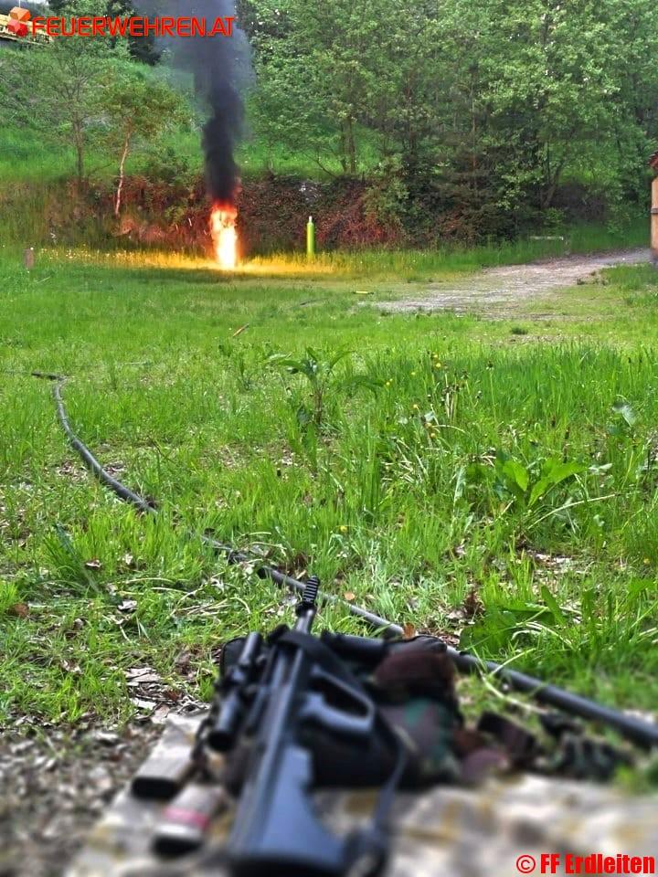Den zweiten Teil der Veranstaltung übernahmen zwei Mitarbeiter der Spezialeinheit „COBRA“ aus Linz. Diese Sondereinheit kann im Einsatzfall über das Landesfeuerwehrkommando angefordert werden. Durch das gezielte Aufschießen einer berstenden Gasflasche kann eine Explosion und damit Schäden massiven Ausmaßes verhindert werden.