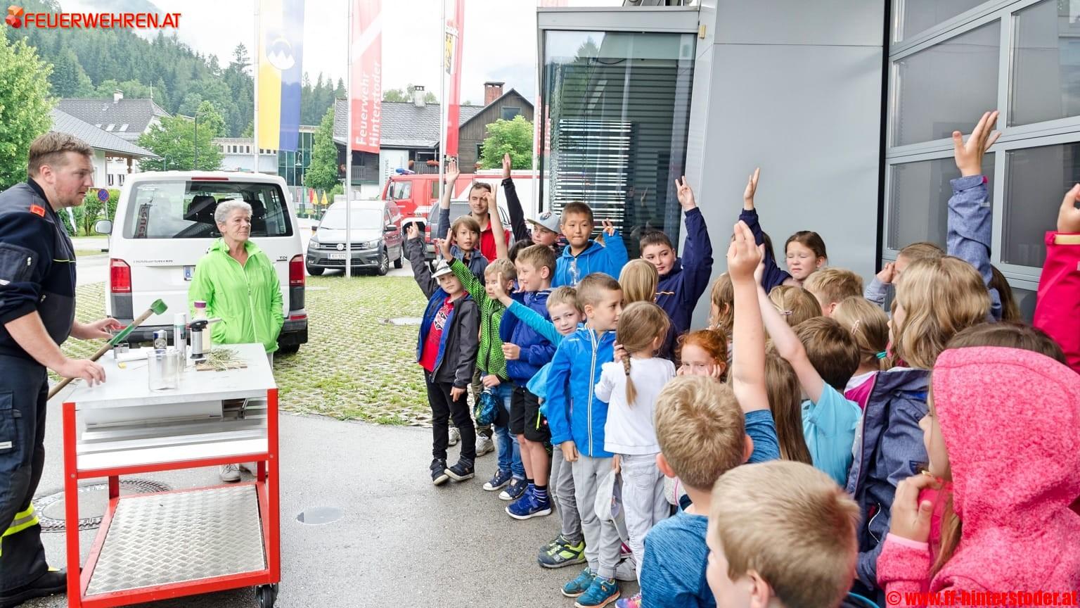 Nach Abschluss der Räumungsübung fanden in der Einsatzzentrale der Feuerwehr Hinterstoder noch das obligatorische Würstlessen und eine praktische Vorführung über die Brennbarkeit von verschiedenen Stoffen statt sowie eine Einschulung zum Richtig Löschen und die Gefahren des Elementes Feuer. Brandinspektor Harald Pesendorfer und Brandinspektor Peter Schoisswohl konnten die Kinder mit den Experimenten in den Bann ziehen.