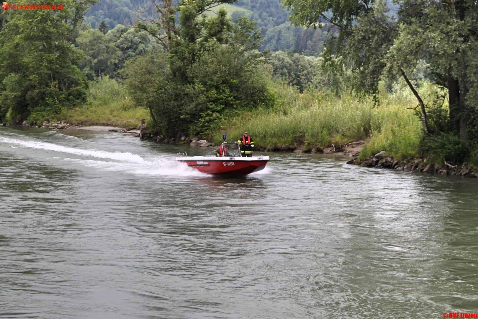 …so das Alarmstichwort für die groß angelegte Bezirkswasserdienstübung der Feuerwehren im Bezirk Liezen. Im Bereich von Aich-Assach wurde eine treibende Person in der Enns gesichtet. Unverzüglich wurde die Feuerwehr Aich alarmiert, welche mit den beiden Zillen in den Einsatz ging.