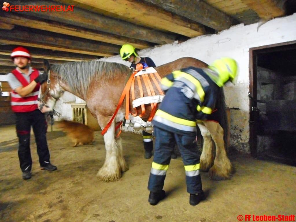 Dank behutsamem Vorgehen der Rettungskräfte und der Mithilfe eines Pferdesanitäters ist es mehrfach gelungen, dem braven „Charly“ ein Großtier-Rettungsgeschirr anzulegen.