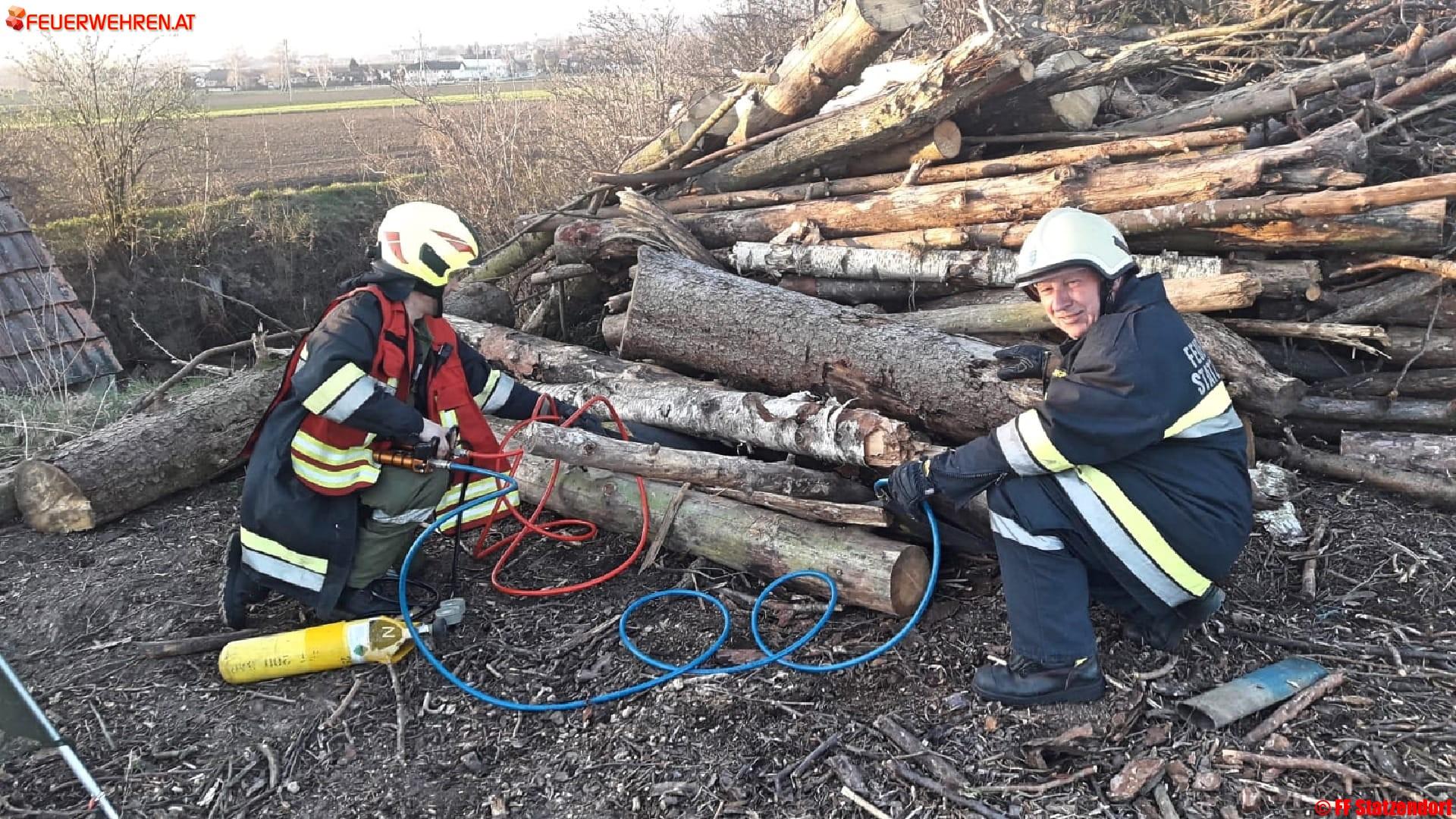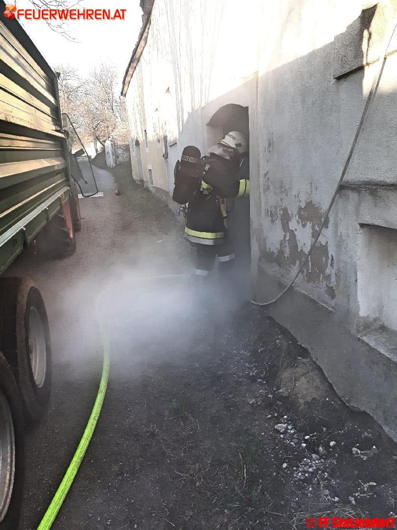 Der Einsatzleiter der Feuerwehr Statzendorf erkundete die Lage und beorderte sofort einen Atemschutztrupp in das Innere des Kellers. Der Auftrag war klar, retten der eingeschlossenen Person. Rasch konnte diese gefunden werden und mittels Korbschleiftrage ins Freie gebracht werden. Anschließend wurde der Brand unter Kontrolle gebracht. Im Außenbereich des Kellers galt es dann noch eine Person bei einem Forstunfall zu retten.