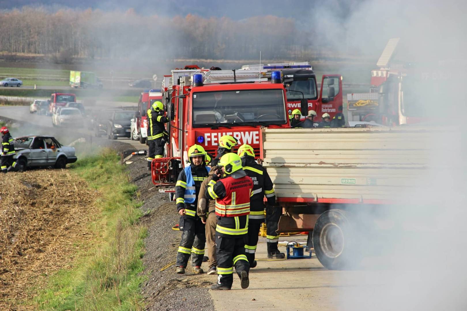 Auf der Baustraße von der sich in Bau befindlichen Fürstenfelder Schnellstrasse S7 fand am Samstag, den 23.11.2019, die Abschnittsübung für die Feuerwehren des Abschnitts 5 statt. Übungsannahme war ein Verkehrsunfallszenario mit insgesamt 6 beteiligten PKW und einem Traktor samt Anhänger.