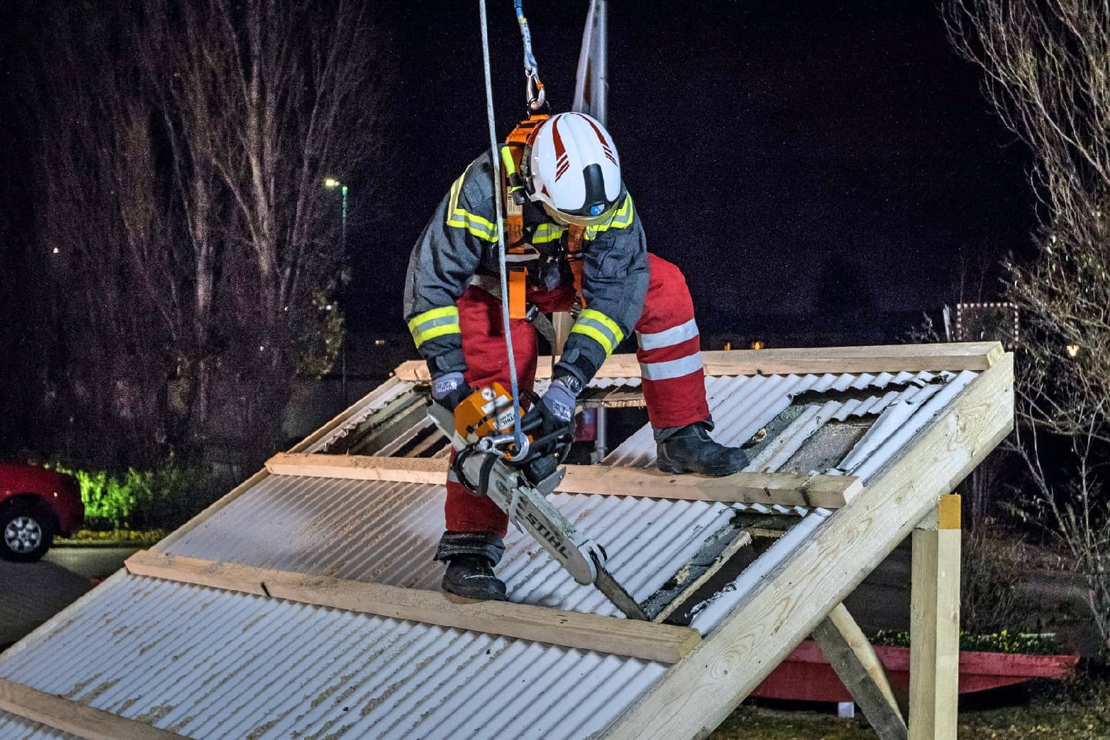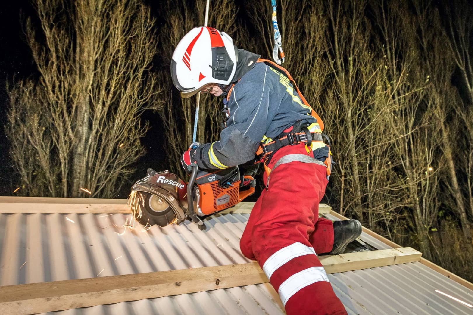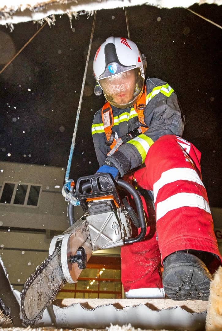 Neben zahlreichen Stationen in der Ebene hatten die Feuerwehrmänner auch die Möglichkeit, die Schaffung von Öffnungen auf einem Übungsdach zu trainieren. Dazu wurde eine Motortrennsäge bzw. eine Motorrettungssäge auf einer eigens dafür gebauten Dachfläche verwendet. Bei dieser Station mussten – wie auch im Einsatz üblich – Geräteführer und Gerät gesichert werden.