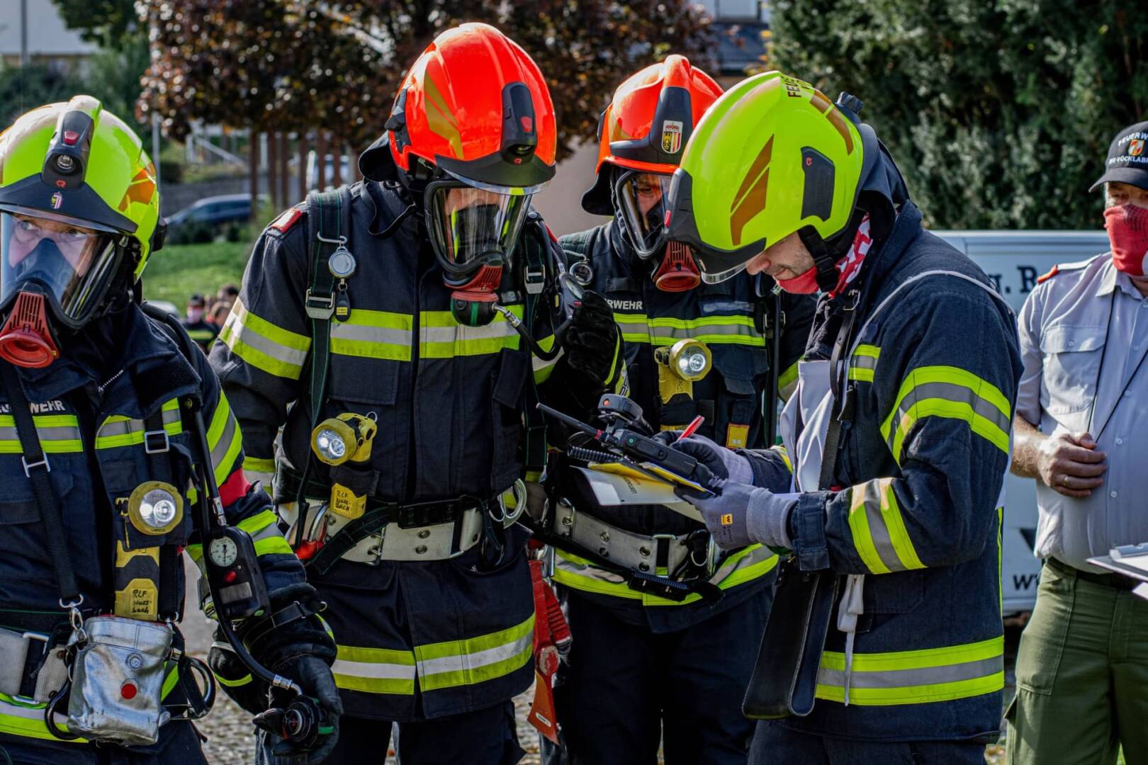 Alle Teilnehmer erhielten im Anschluß das Silberne Leistungsabzeichen. Der Bezirksfeuerwehrkommandant OBR Helmut Berc bedankt sich bei den Teilnehmern für die Disziplin im Training und bei der Leistungsprüfung. Er lud im Anschluß an die Übergabe der Abzeichen, welche nicht wie gewohnt mit der persönlichen Übergabe sondern durch selbstständiges Entnehmen vom Tablet stattfand, zum Essen ins Feuerwehrhaus Nußbach ein.