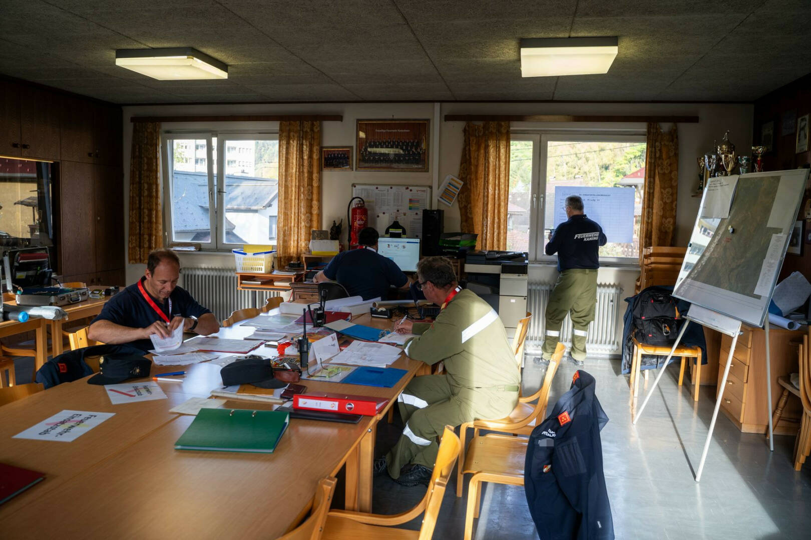Ein weiterer Teil der Übung war die Bildung eines Einsatzstabes im Rüsthaus Radenthein. Die Mitglieder unterstützen die Einsatzkräfte vor Ort und führten weitere Stabsarbeit durch.