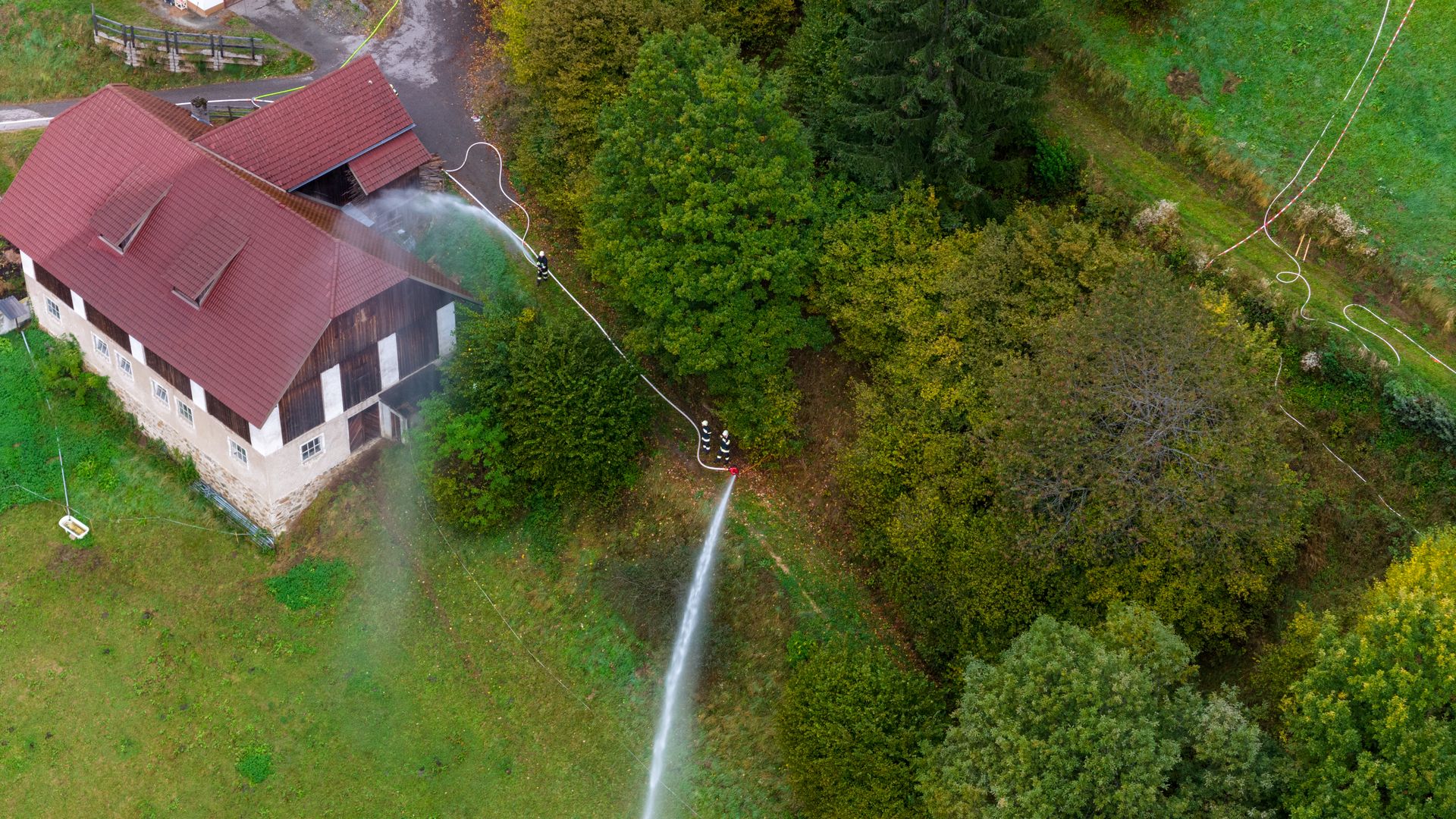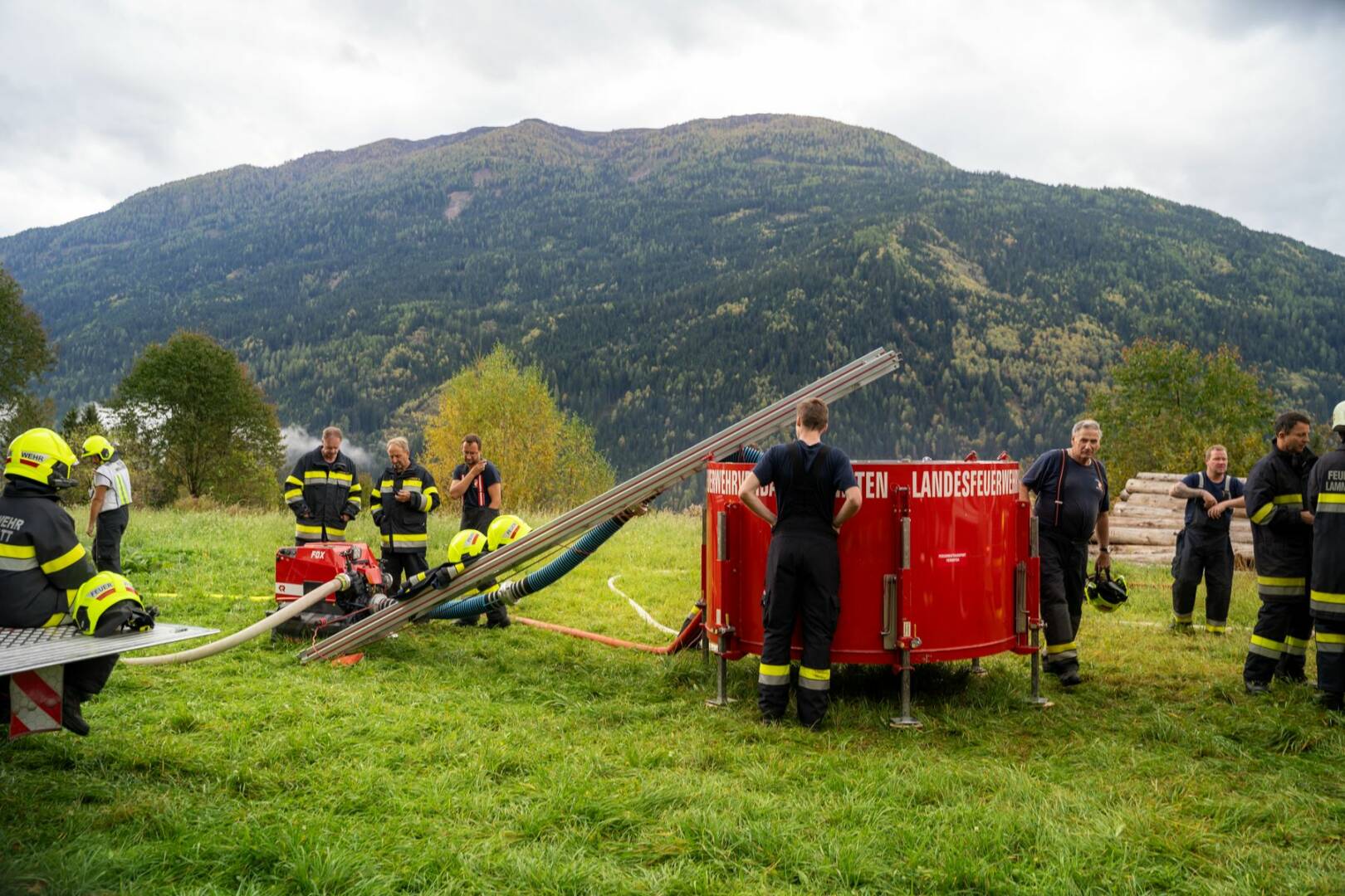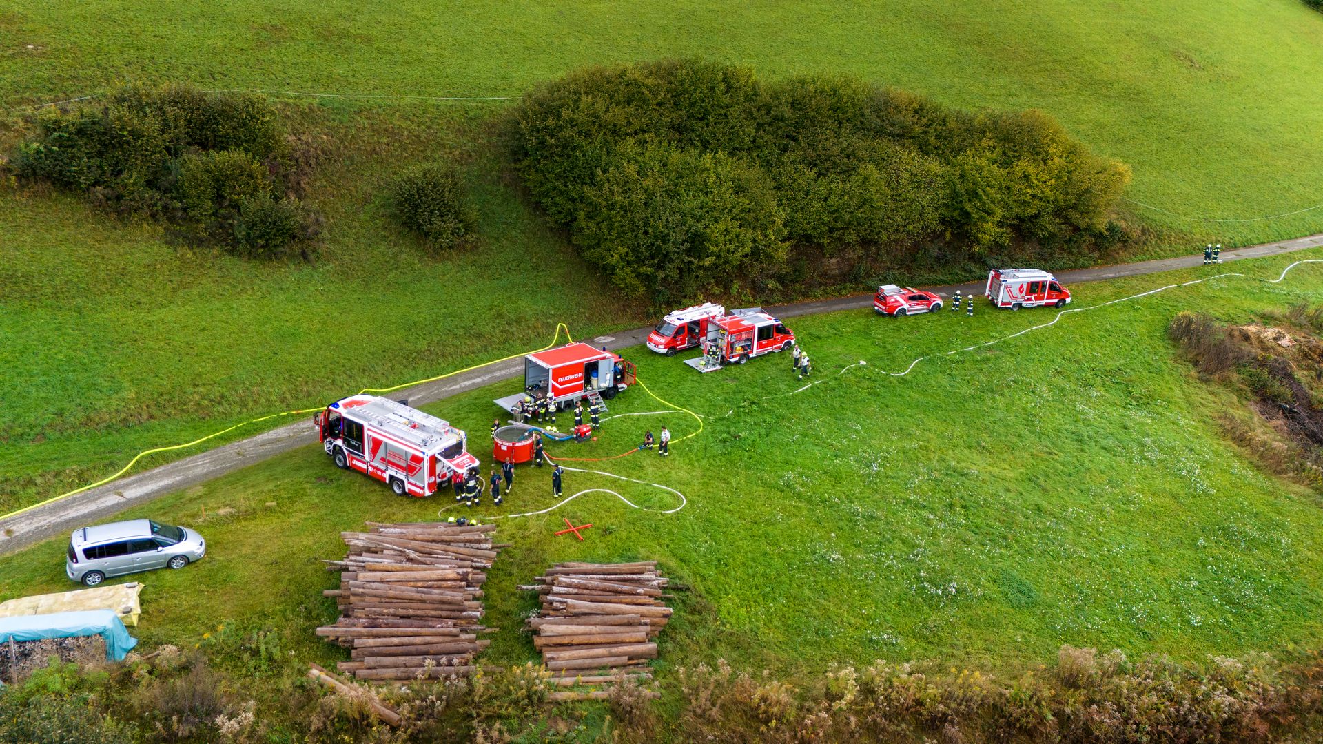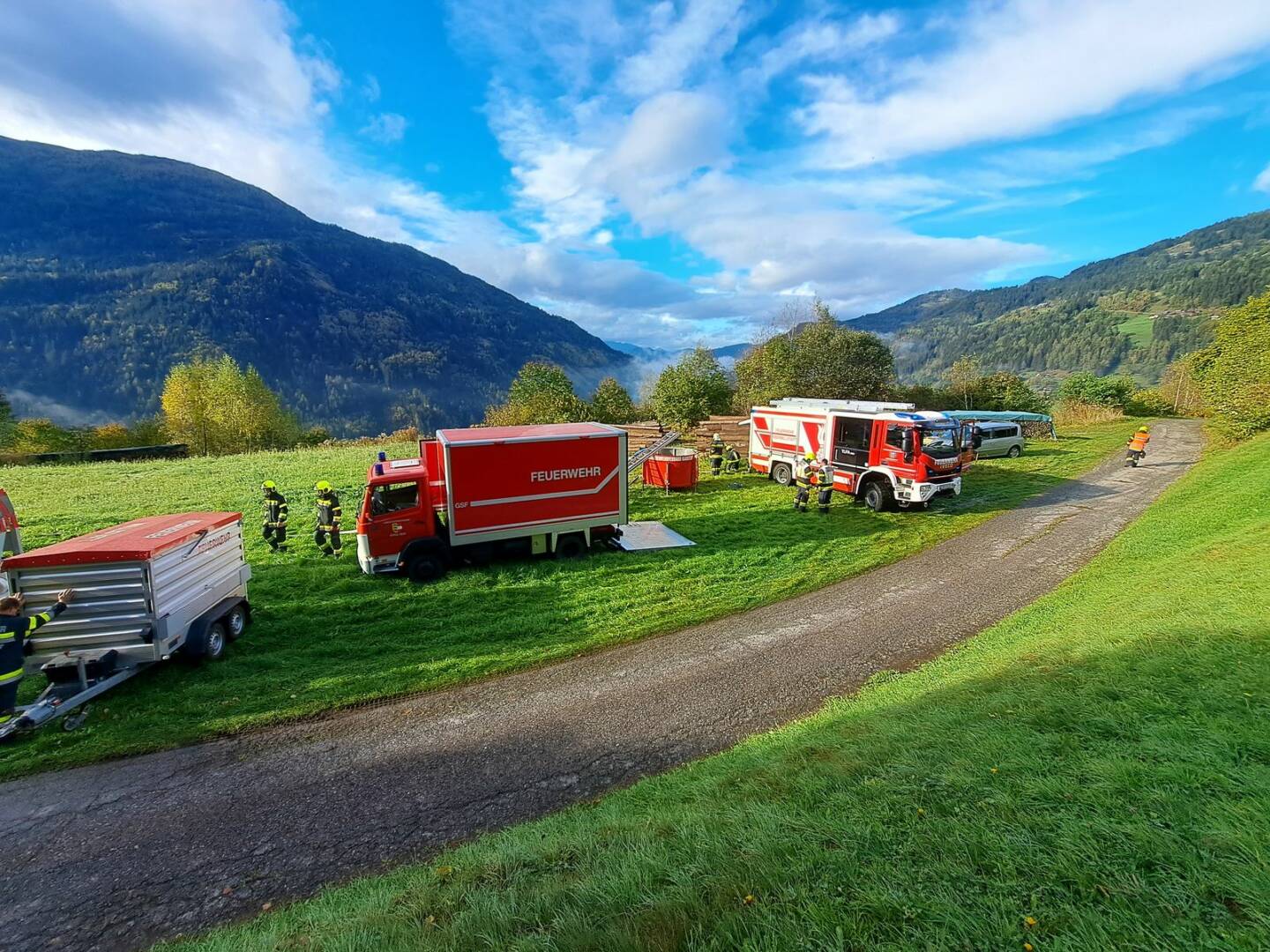 Über 180 Freiwillige übten am Samstag, dem 21. Oktober 2023 für den Ernstfall. Das angenommene Szenario, ein Wirtschaftsgebäudebrand im Ortsteil Frischg, der sich auf die umliegenden Wälder und Wiesen ausbreitet, musste bewältigt werden. Die größte Herausforderung dabei war die Herstellung einer ausreichenden Löschwasserversorgung.