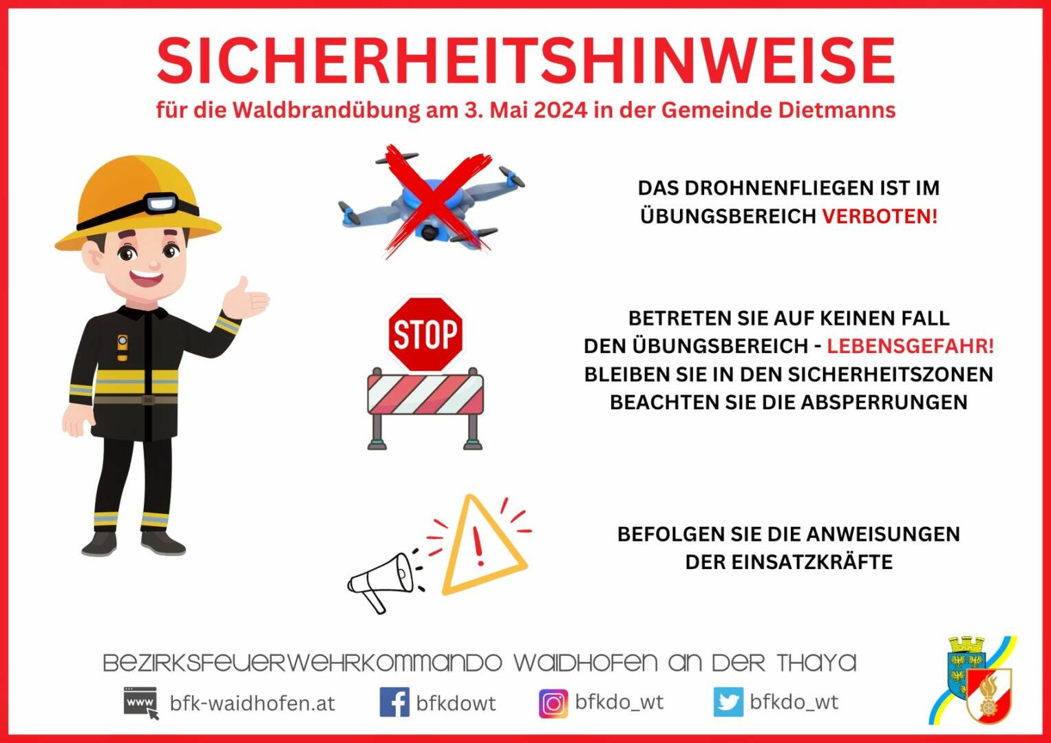13 Feuerwehren aus dem Bezirk Waidhofen an der Thaya üben gemeinsam mit Feuerwehreinheiten aus ganz Niederösterreich, dem Österreichischen Bundesheer, der Polizei und dem Roten Kreuz den Ernstfall. Übungsannahme ist ein großflächiger Waldbrand. Bei dieser Übung kommen Spezialkräfte aus den Feuerwehr-Sonderdiensten „Flugdienst“ und „Waldbrandbekämpfung“ zum Einsatz. Sie werden von Hubschraubern und Flugzeugen des Österreichischen Bundesheeres und der Polizei unterstützt.