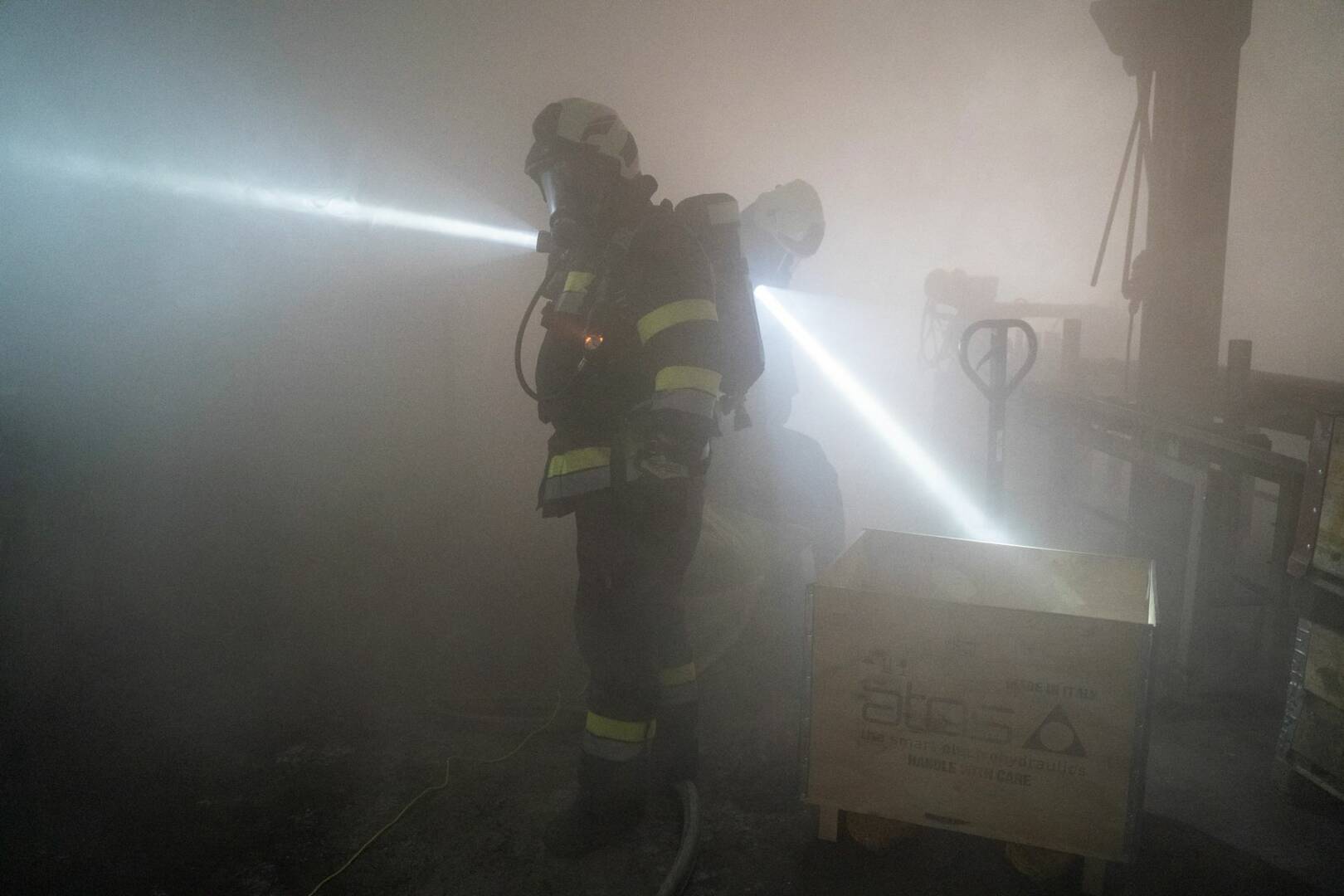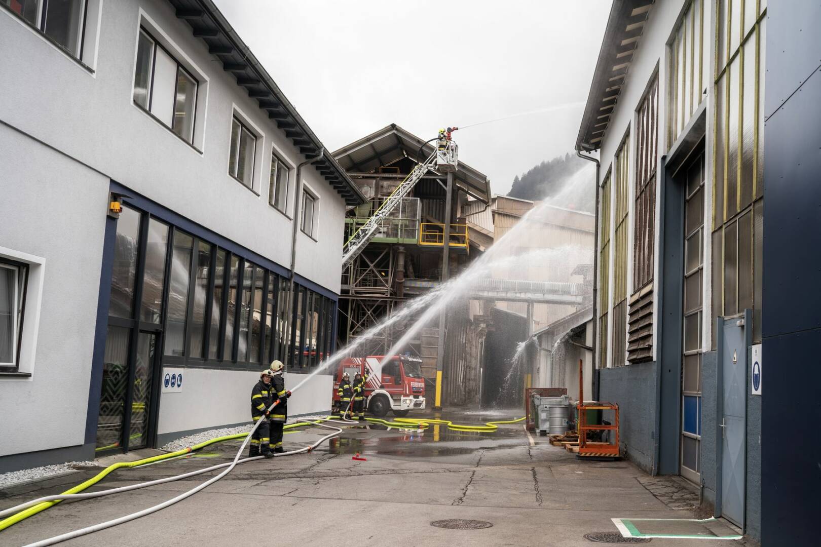 Die enorme Größe der Halle stellte besonders für die insgesamt acht eingesetzten Atemschutztrupps eine große Herausforderung dar. Durch sie mussten zehn vermissten Personen gefunden und gerettet werden. Der gleichzeitig durchgeführte kombinierte Außen- und Innenangriff erforderte einen erheblichen Wasserbedarf. Dieser wurde einerseits über das am Werksgelände befindliche Hydrantennetz und andererseits über eine durch die Feuerwehren aufgebaute Förderleitung vom nahegelegenen „Riegerbach“ sichergestellt.