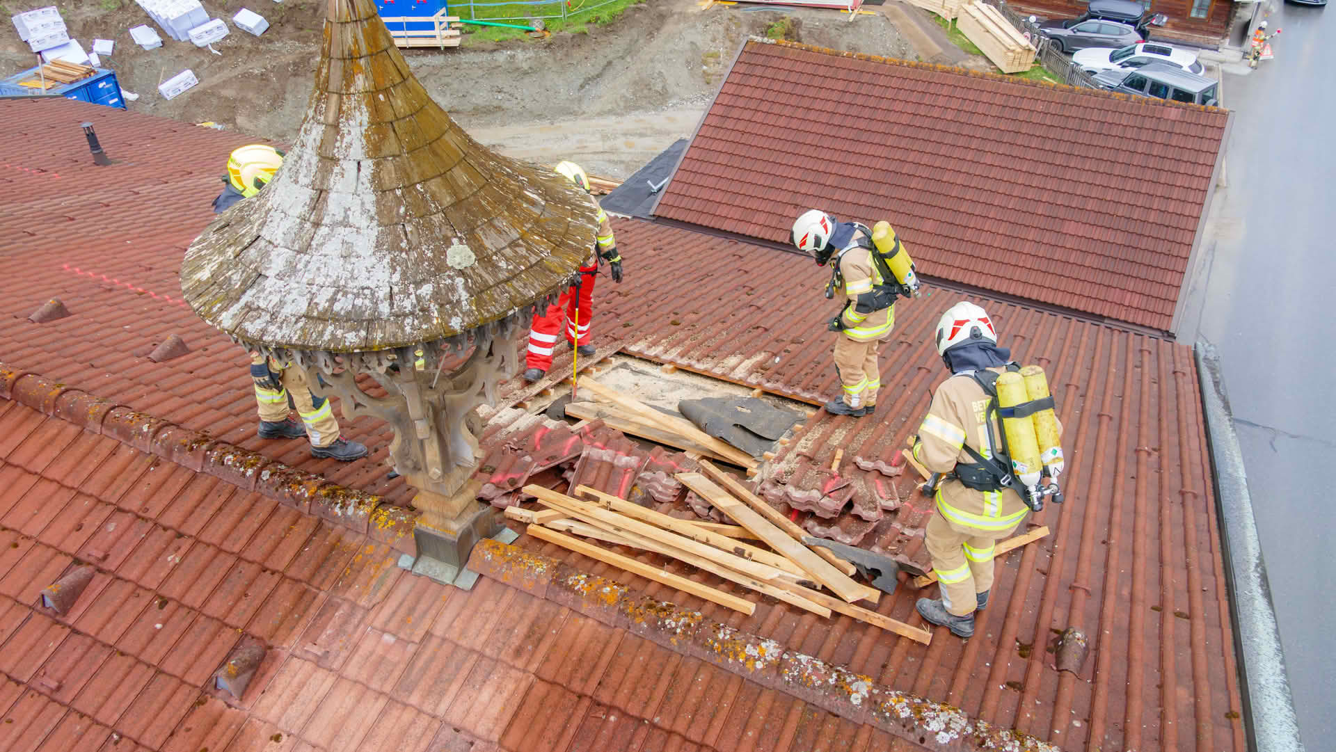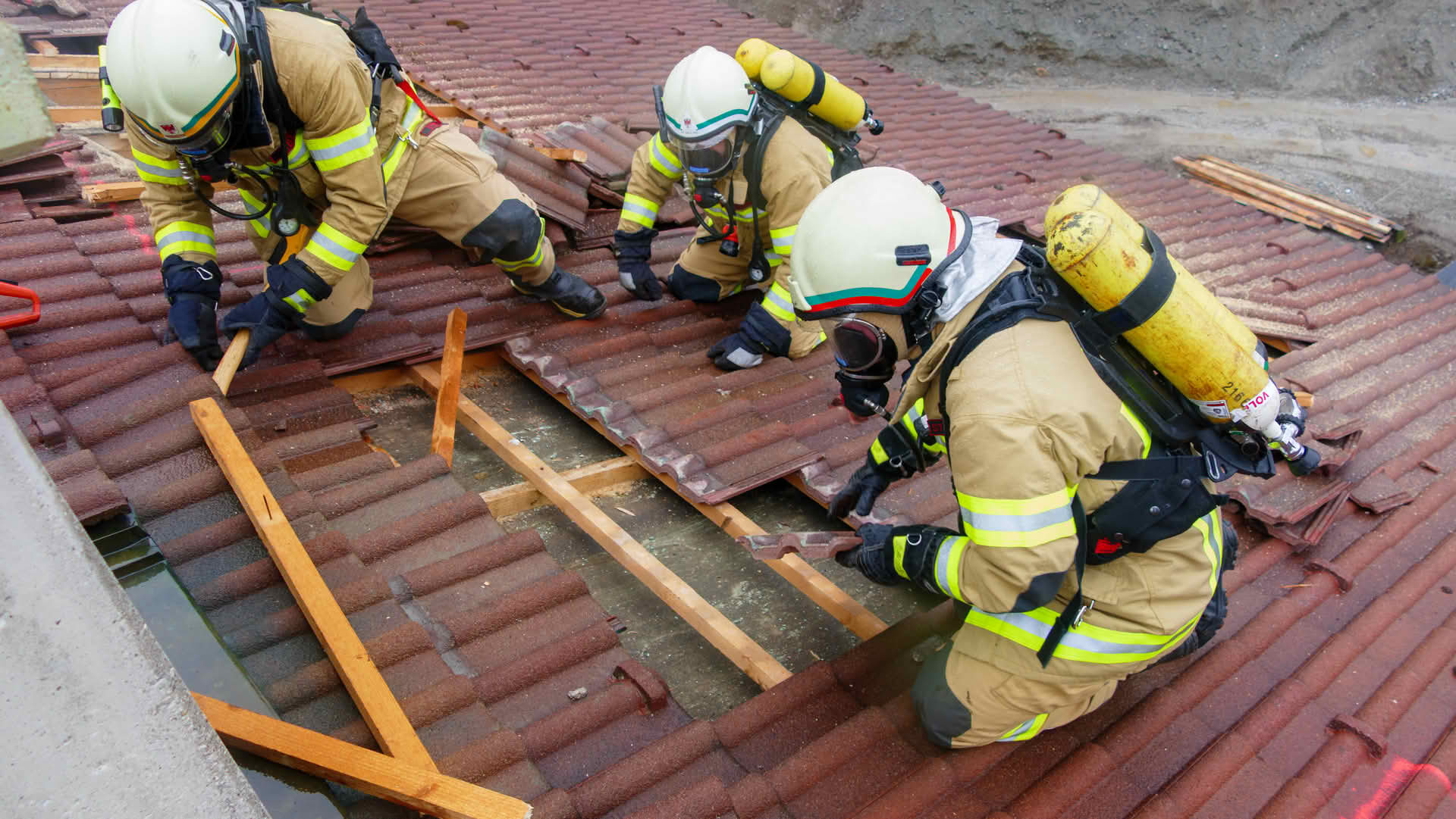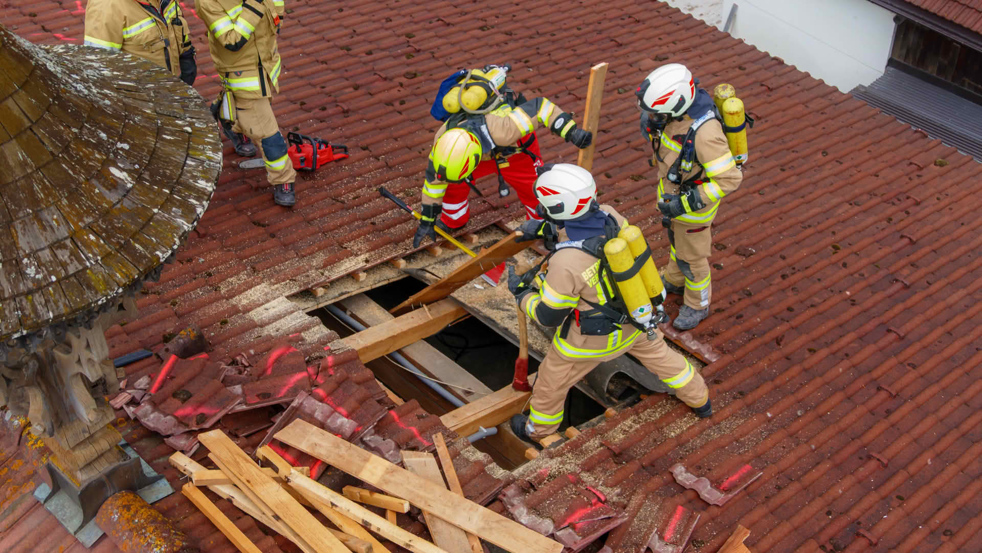 Dachöffnung: Über die Drehleiter gelangten die Trupps auf das Dach des Übungsobjekts, wo unter schwerem Atemschutz Dachziegel entfernt und die Dachhaut geöffnet werden musste, um einen fiktiven Dachstuhlbrand zu bekämpfen.