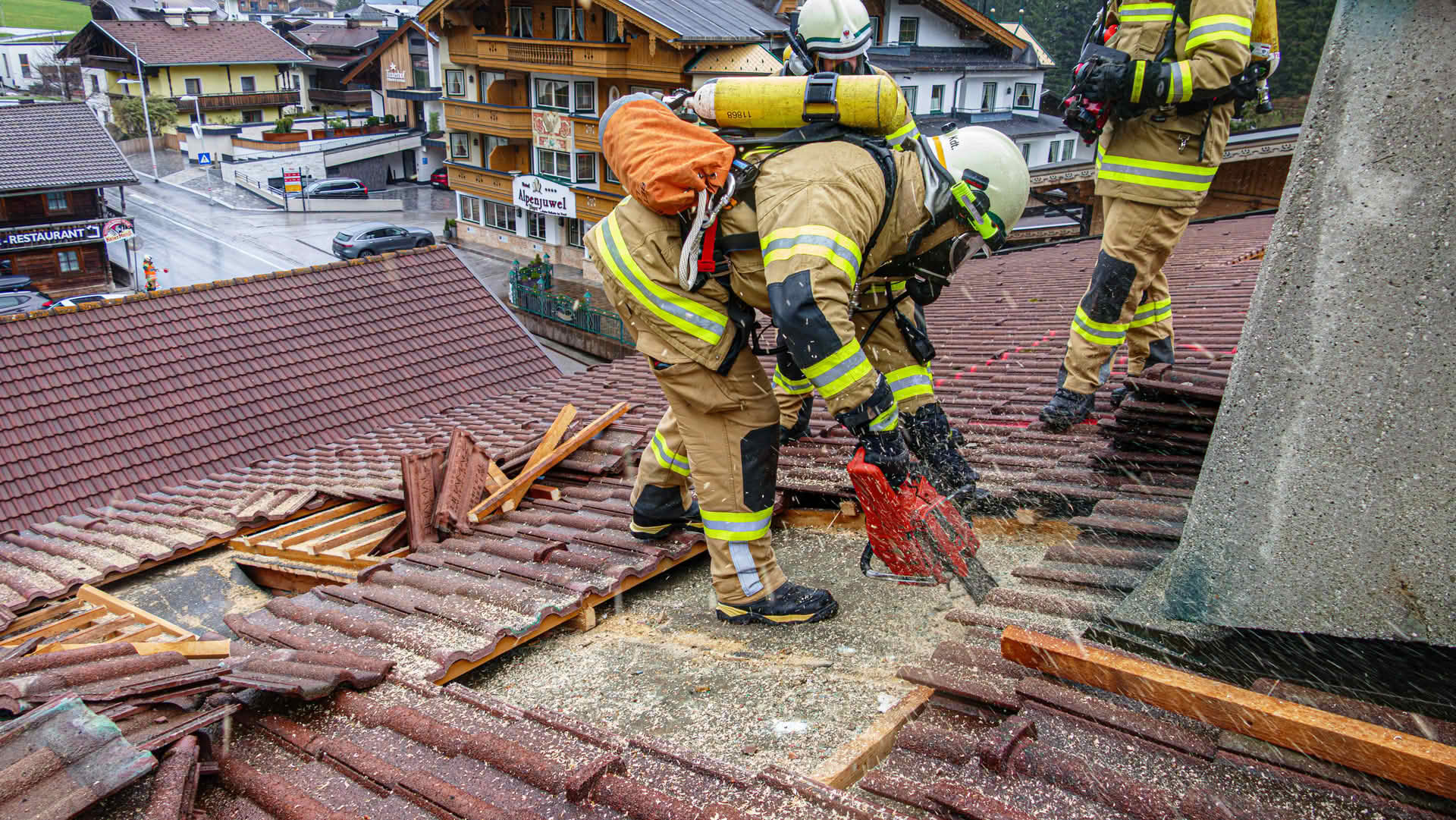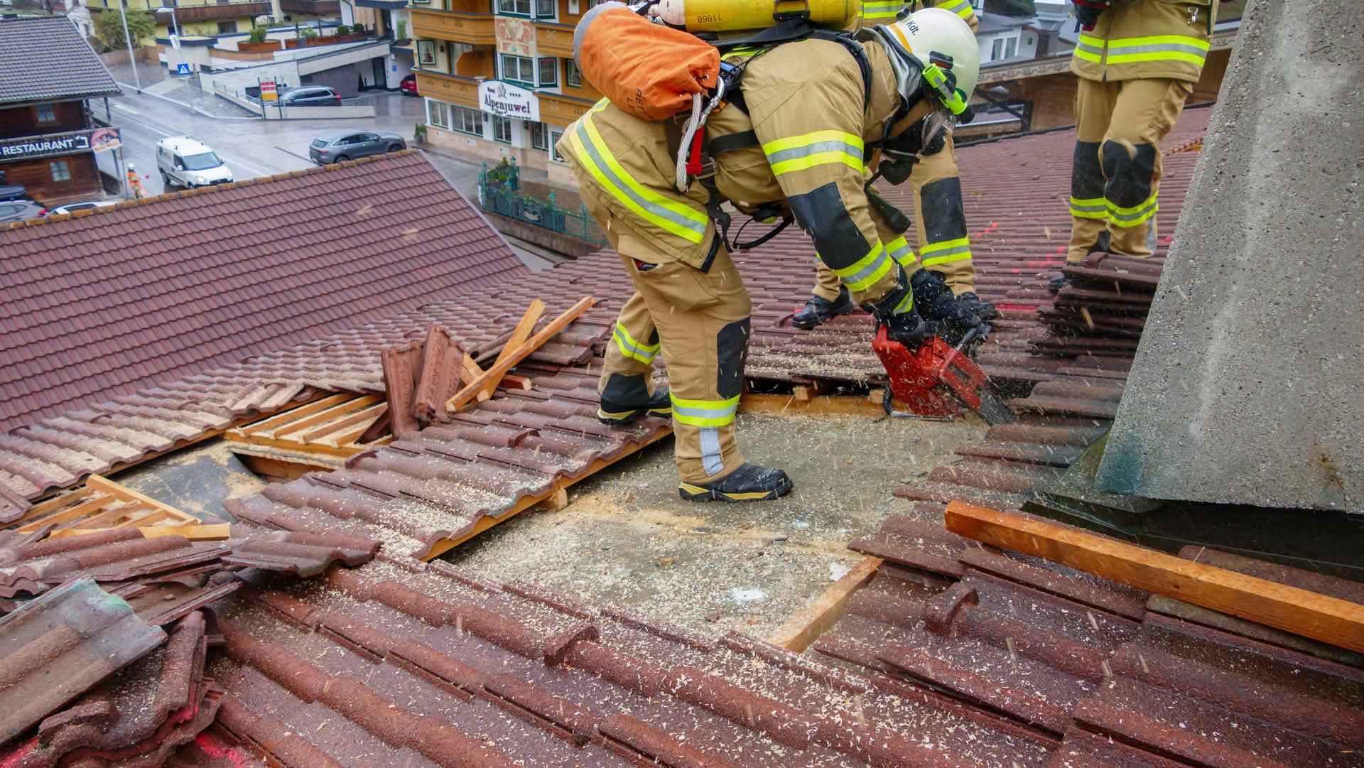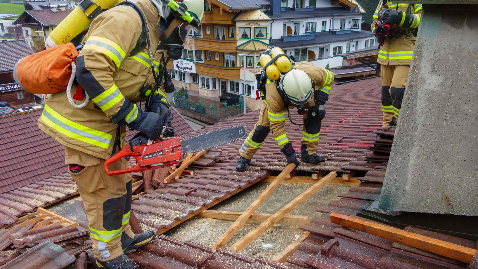 Dachöffnung: Über die Drehleiter gelangten die Trupps auf das Dach des Übungsobjekts, wo unter schwerem Atemschutz Dachziegel entfernt und die Dachhaut geöffnet werden musste, um einen fiktiven Dachstuhlbrand zu bekämpfen.