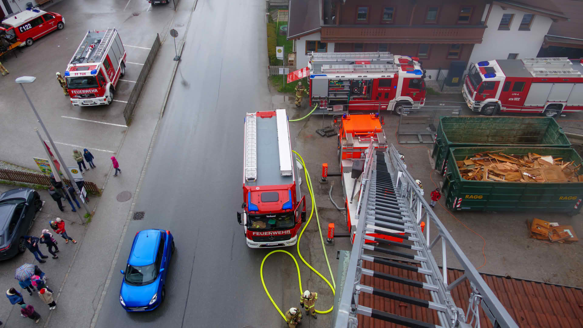 An der Übung nahmen die Feuerwehren Finkenberg, Mayrhofen, Betriebsfeuerwehr Verbund, Ginzling, Schwendau, Aschau im Zillertal sowie die ausführende Feuerwehr Tux teil. Unterstützt wurden die Kameraden der FF Tux von der Stadtfeuerwehr Schwaz, die mit drei Kameraden sowie dem Wechselladerfahrzeug und dem Abrollcontainer Atemschutz vor Ort waren.