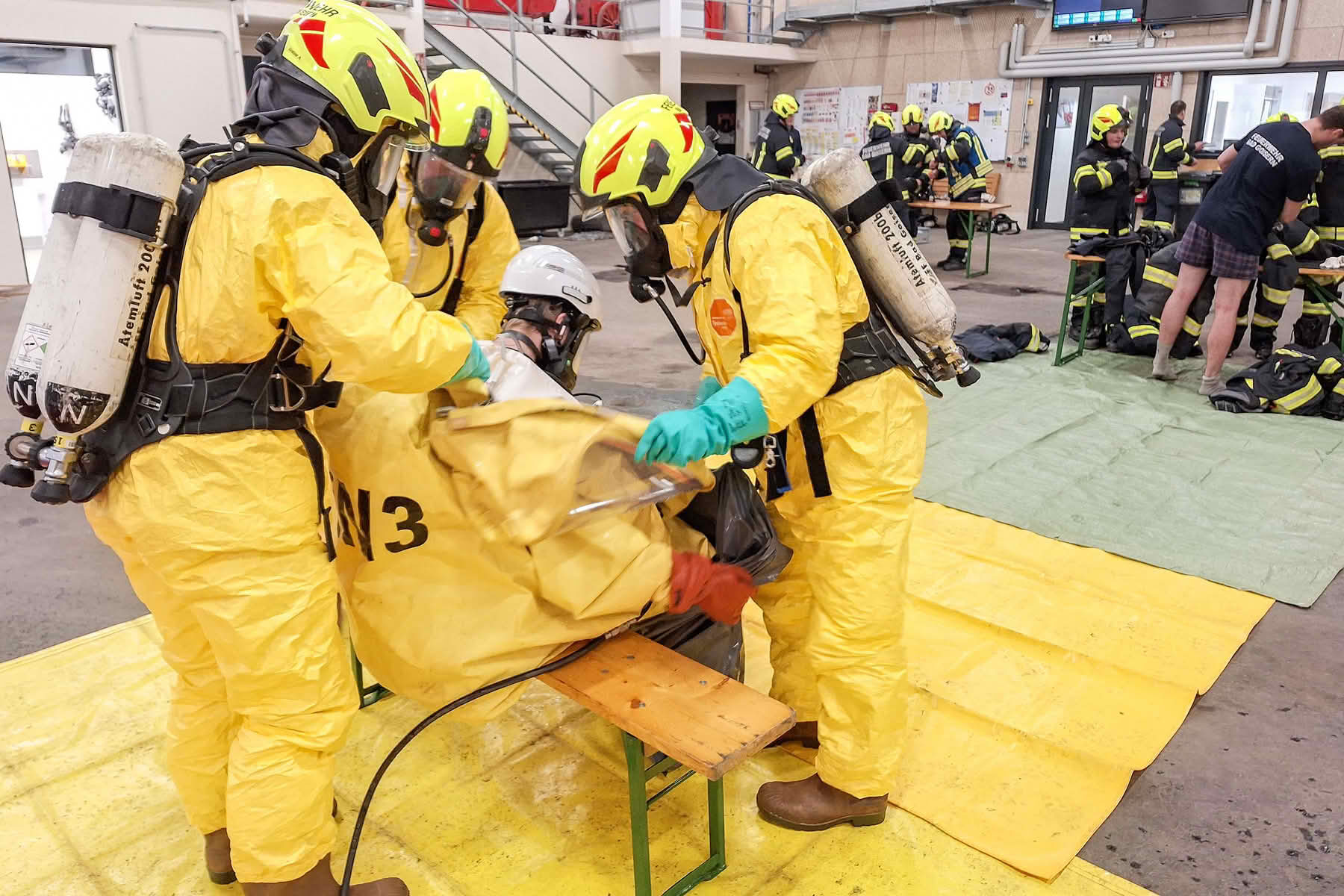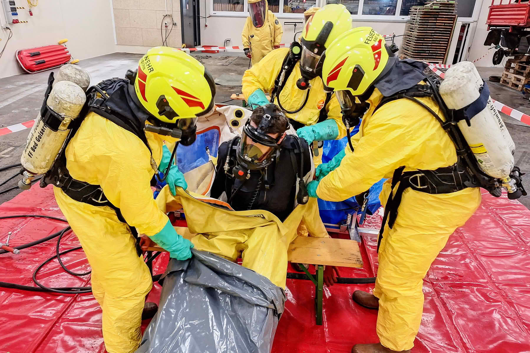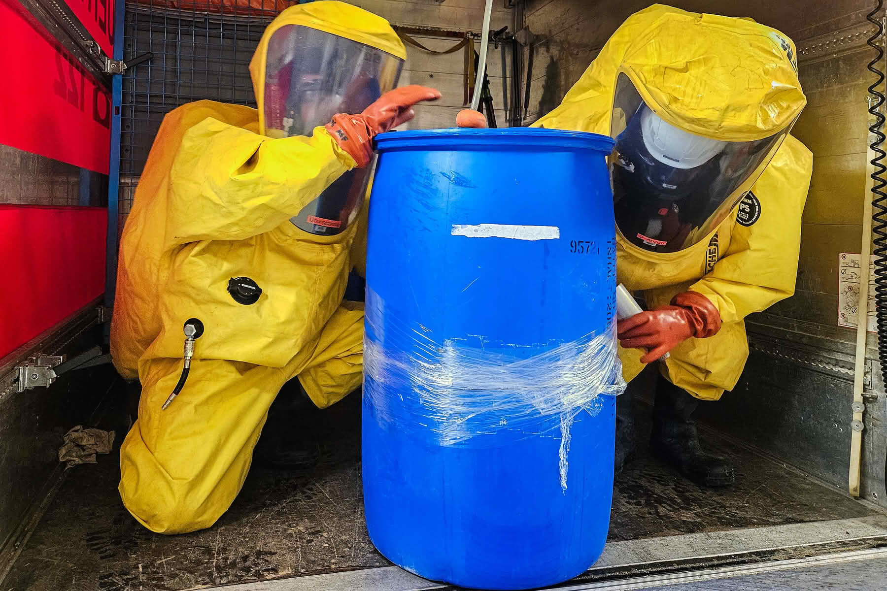 Nur unter speziellen, gasdichten Schutzanzügen (Schutzstufe-III) konnte folglich ein Trupp zu dem leckgeschlagenen Behältnis vordringen, die Flüssigkeit auffangen und das Fass schließlich abdichten.