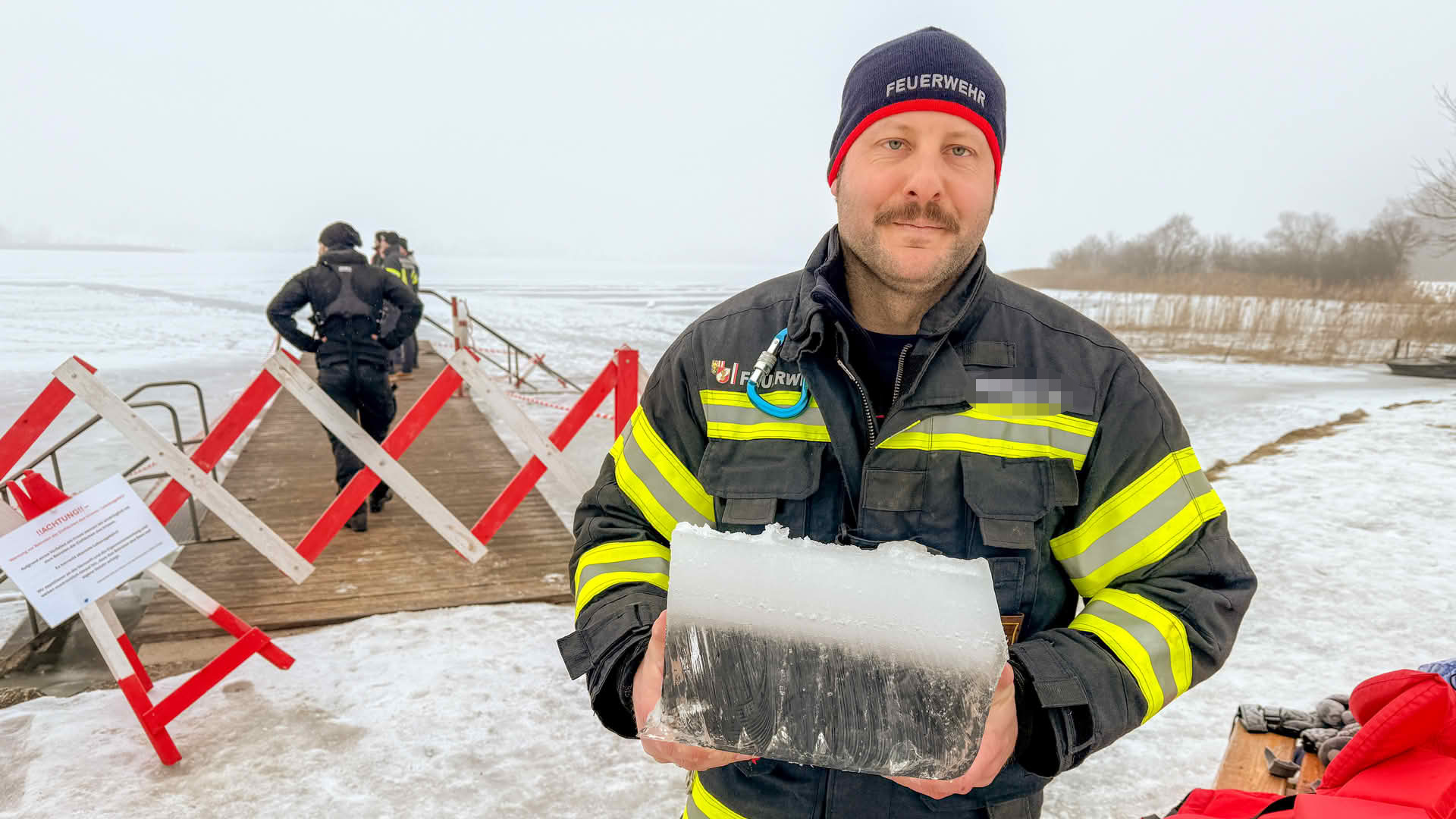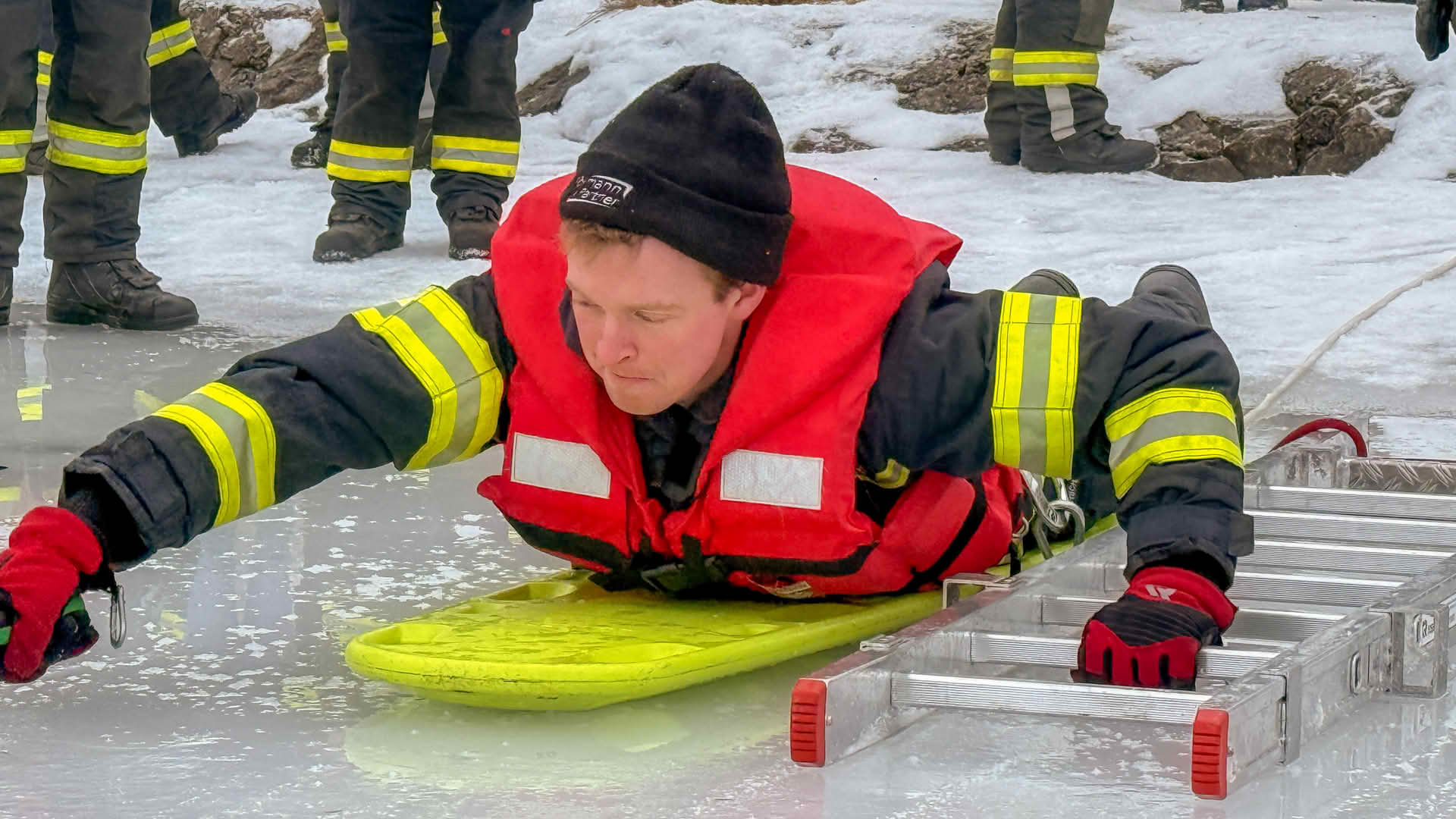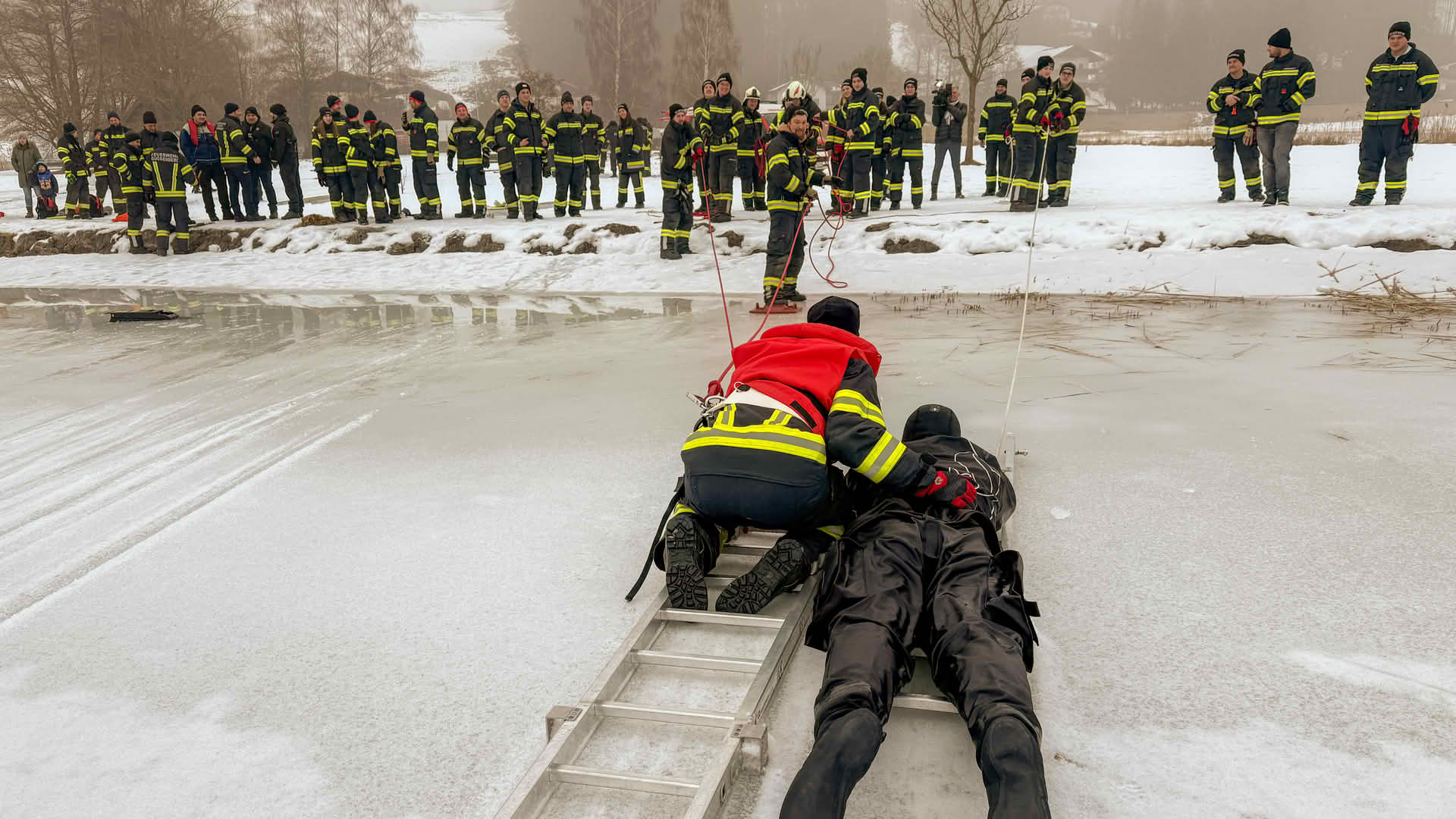 Der Feuerwehrtaucher und Tauchgruppenleiter Jonathan Hansel schulte und vertiefte das vorhandene Wissen der Einsatzkräfte zum Thema Eisrettung, Unterkühlung und Belastbarkeit der Eisfläche. Bevor es zu den Praxisübungen auf den Irrsee ging, berichtete noch der Polizist, der versucht hatte, die eingebrochenen Frauen zu retten von der Rettungsaktion.
